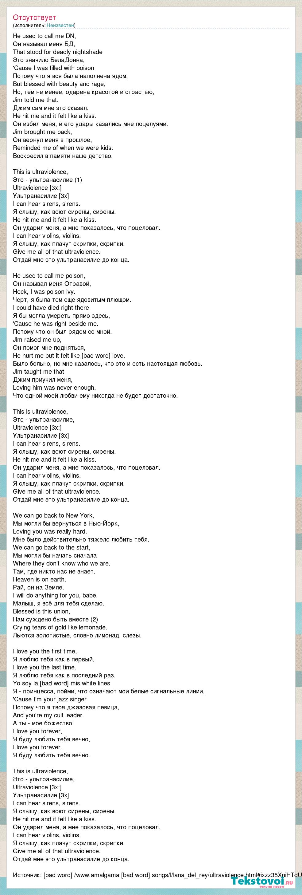 He used to call me DN, Он называл меня БД, That stood for deadly nightshade Это значило БелаДонна, 'Cause I was filled with poison Потому что я вся была наполнена ядом, But blessed with beauty and rage, Но, тем не менее, одарена красотой и страстью, Jim told me that. Джим сам мне это сказал. He hit me and it felt like a kiss. Он избил меня, и его удары казались мне поцелуями. Jim brought me back, Он вернул меня в прошлое, Reminded me of when we were kids. Воскресил в памяти наше детство. This is ultraviolence, Это - ультранасилие (1) Ultraviolence [3x:] Ультранасилие [3x] I can hear sirens, sirens. Я слышу, как воют сирены, сирены. He hit me and it felt like a kiss. Он ударил меня, а мне показалось, что поцеловал. I can hear violins, violins. Я слышу, как плачут скрипки, скрипки. Give me all of that ultraviolence. Отдай мне это ультранасилие до конца. He used to call me poison, Он называл меня Отравой, Heck, I was poison ivy. Черт, я была тем еще ядовитым плющом. I could have died right there Я бы могла умереть прямо здесь, 'Cause he was right beside me. Потому что он был рядом со мной. Jim raised me up, Он помог мне подняться, He hurt me but it felt like true love. Было больно, но мне казалось, что это и есть настоящая любовь. Jim taught me that Джим приучил меня, Loving him was never enough. Что одной моей любви ему никогда не будет достаточно. This is ultraviolence, Это - ультранасилие, Ultraviolence [3x:] Ультранасилие [3x] I can hear sirens, sirens. Я слышу, как воют сирены, сирены. He hit me and it felt like a kiss. Он ударил меня, а мне показалось, что поцеловал. I can hear violins, violins. Я слышу, как плачут скрипки, скрипки. Give me all of that ultraviolence. Отдай мне это ультранасилие до конца. We can go back to New York, Мы могли бы вернуться в Нью-Йорк, Loving you was really hard. Мне было действительно тяжело любить тебя. We can go back to the start, Мы могли бы начать сначала Where they don't know who we are. Там, где никто нас не знает. Heaven is on earth. Рай, он на Земле. I will do anything for you, babe. Малыш, я всё для тебя сделаю. Blessed is this union, Нам суждено быть вместе (2) Crying tears of gold like lemonade. Льются золотистые, словно лимонад, слезы. I love you the first time, Я люблю тебя как в первый, I love you the last time. Я люблю тебя как в последний раз. Yo soy la princesa, comprende mis white lines Я - принцесса, пойми, что означают мои белые сигнальные линии, 'Cause I'm your jazz singer Потому что я твоя джазовая певица, And you're my cult leader. А ты - мое божество. I love you forever, Я буду любить тебя вечно, I love you forever. Я буду любить тебя вечно. This is ultraviolence, Это - ультранасилие, Ultraviolence [3x:] Ультранасилие [3x] I can hear sirens, sirens. Я слышу, как воют сирены, сирены. He hit me and it felt like a kiss. Он ударил меня, а мне показалось, что поцеловал. I can hear violins, violins. Я слышу, как плачут скрипки, скрипки. Give me all of that ultraviolence. Отдай мне это ультранасилие до конца. Источник: [bad word] /www.amalgama [bad word] songs/l/lana_del_rey/ultraviolence.html#ixzz35XniHTdU