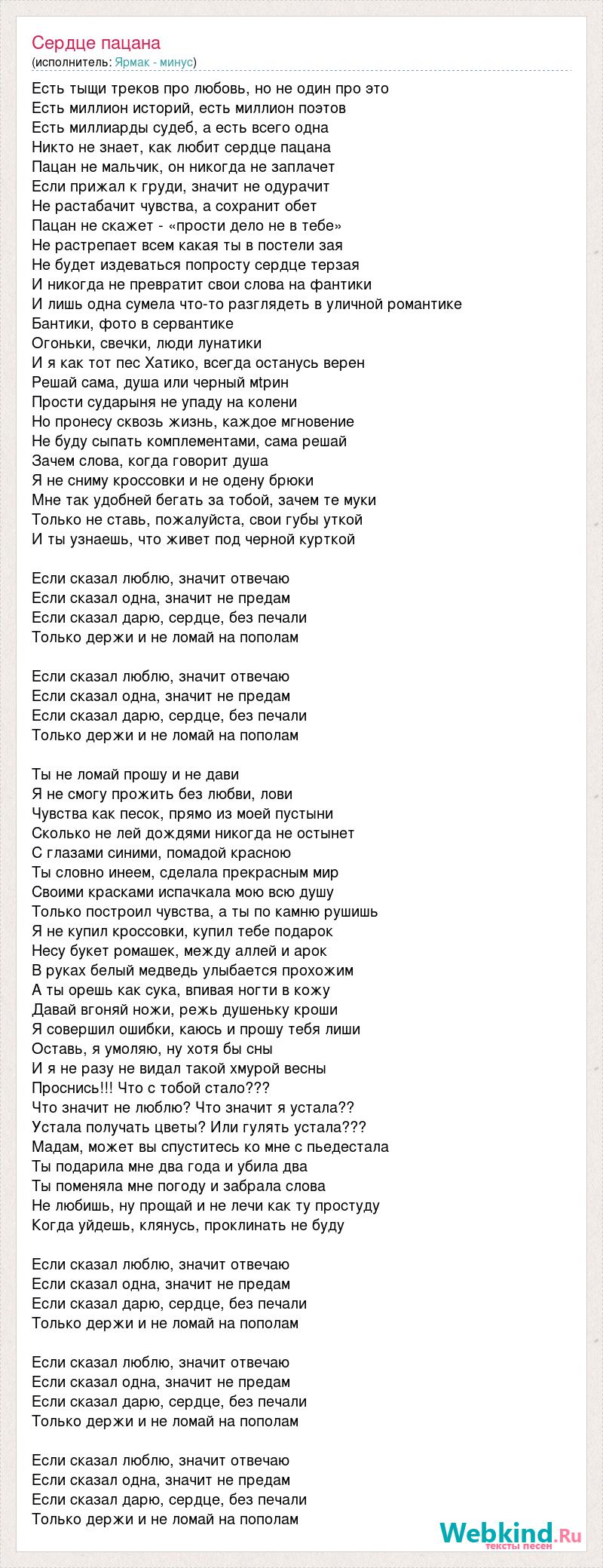 Есть тыщи треков про любовь, но не один про это Есть миллион историй, есть миллион поэтов Есть миллиарды судеб, а есть всего одна Никто не знает, как любит сердце пацана Пацан не мальчик, он никогда не заплачет Если прижал к груди, значит не одурачит Не растабачит чувства, а сохранит обет Пацан не скажет - «прости дело не в тебе» Не растрепает всем какая ты в постели зая Не будет издеваться попросту сердце терзая И никогда не превратит свои слова на фантики И лишь одна сумела что-то разглядеть в уличной романтике Бантики, фото в сервантике Огоньки, свечки, люди лунатики И я как тот пес Хатико, всегда останусь верен Решай сама, душа или черный мtрин Прости сударыня не упаду на колени Но пронесу сквозь жизнь, каждое мгновение Не буду сыпать комплементами, сама решай Зачем слова, когда говорит душа Я не сниму кроссовки и не одену брюки Мне так удобней бегать за тобой, зачем те муки Только не ставь, пожалуйста, свои губы уткой И ты узнаешь, что живет под черной курткой Если сказал люблю, значит отвечаю Если сказал одна, значит не предам Если сказал дарю, сердце, без печали Только держи и не ломай на пополам Если сказал люблю, значит отвечаю Если сказал одна, значит не предам Если сказал дарю, сердце, без печали Только держи и не ломай на пополам Ты не ломай прошу и не дави Я не смогу прожить без любви, лови Чувства как песок, прямо из моей пустыни Сколько не лей дождями никогда не остынет С глазами синими, помадой красною Ты словно инеем, сделала прекрасным мир Своими красками испачкала мою всю душу Только построил чувства, а ты по камню рушишь Я не купил кроссовки, купил тебе подарок Несу букет ромашек, между аллей и арок В руках белый медведь улыбается прохожим А ты орешь как сука, впивая ногти в кожу Давай вгоняй ножи, режь душеньку кроши Я совершил ошибки, каюсь и прошу тебя лиши Оставь, я умоляю, ну хотя бы сны И я не разу не видал такой хмурой весны Проснись!!! Что с тобой стало??? Что значит не люблю? Что значит я устала?? Устала получать цветы? Или гулять устала??? Мадам, может вы спуститесь ко мне с пьедестала Ты подарила мне два года и убила два Ты поменяла мне погоду и забрала слова Не любишь, ну прощай и не лечи как ту простуду Когда уйдешь, клянусь, проклинать не буду Если сказал люблю, значит отвечаю Если сказал одна, значит не предам Если сказал дарю, сердце, без печали Только держи и не ломай на пополам Если сказал люблю, значит отвечаю Если сказал одна, значит не предам Если сказал дарю, сердце, без печали Только держи и не ломай на пополам Если сказал люблю, значит отвечаю Если сказал одна, значит не предам Если сказал дарю, сердце, без печали Только держи и не ломай на пополам