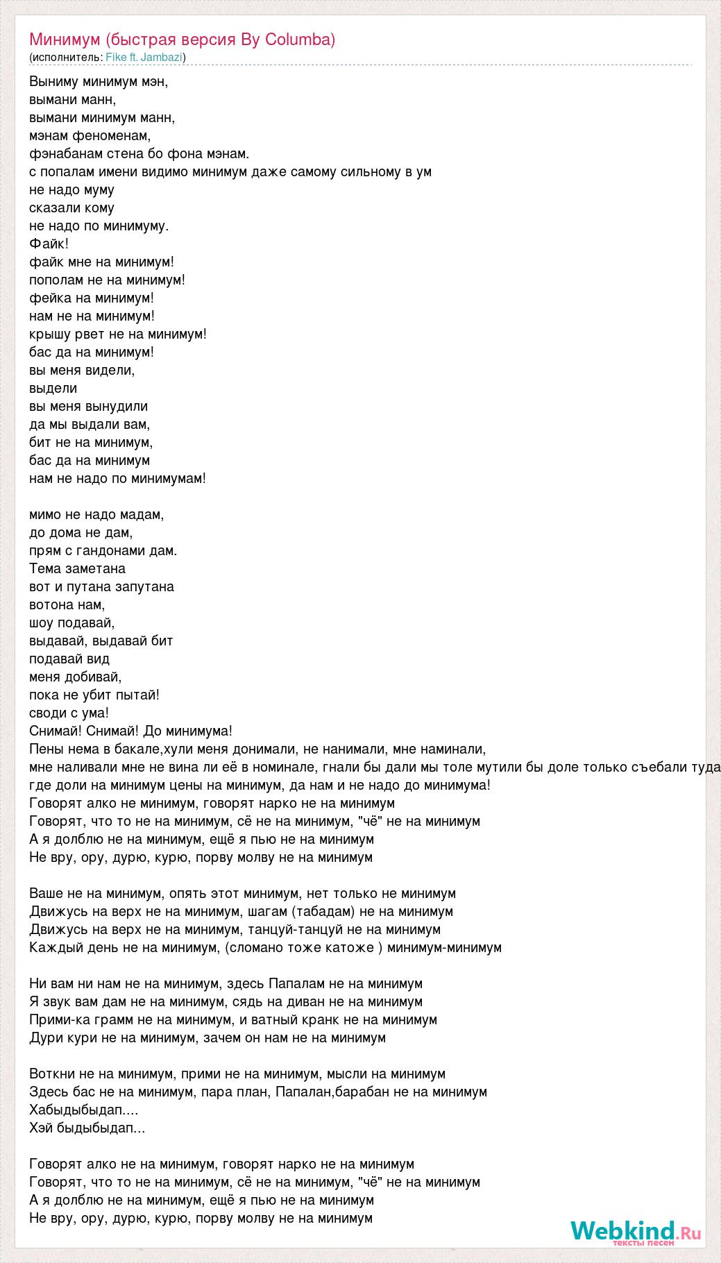 Выниму минимум мэн, вымани манн, вымани минимум манн, мэнам феноменам, фэнабанам стена бо фона мэнам. с попалам имени видимо минимум даже самому сильному в ум не надо муму сказали кому не надо по минимуму. Файк! файк мне на минимум! пополам не на минимум! фейка на минимум! нам не на минимум! крышу рвет не на минимум! бас да на минимум! вы меня видели, выдели вы меня вынудили да мы выдали вам, бит не на минимум, бас да на минимум нам не надо по минимумам! мимо не надо мадам, до дома не дам, прям с гандонами дам. Тема заметана вот и путана запутана вотона нам, шоу подавай, выдавай, выдавай бит подавай вид меня добивай, пока не убит пытай! своди с ума! Снимай! Снимай! До минимума! Пены нема в бакале,хули меня донимали, не нанимали, мне наминали, мне наливали мне не вина ли её в номинале, гнали бы дали мы толе мутили бы доле только съебали туда где доли на минимум цены на минимум, да нам и не надо до минимума! Говорят алко не минимум, говорят нарко не на минимум Говорят, что то не на минимум, сё не на минимум, "чё" не на минимум А я долблю не на минимум, ещё я пью не на минимум Не вру, ору, дурю, курю, порву молву не на минимум Ваше не на минимум, опять этот минимум, нет только не минимум Движусь на верх не на минимум, шагам (табадам) не на минимум Движусь на верх не на минимум, танцуй-танцуй не на минимум Каждый день не на минимум, (сломано тоже катоже ) минимум-минимум Ни вам ни нам не на минимум, здесь Папалам не на минимум Я звук вам дам не на минимум, сядь на диван не на минимум Прими-ка грамм не на минимум, и ватный кранк не на минимум Дури кури не на минимум, зачем он нам не на минимум Воткни не на минимум, прими не на минимум, мысли на минимум Здесь бас не на минимум, пара план, Папалан,барабан не на минимум Хабыдыбыдап.... Хэй быдыбыдап... Говорят алко не на минимум, говорят нарко не на минимум Говорят, что то не на минимум, сё не на минимум, "чё" не на минимум А я долблю не на минимум, ещё я пью не на минимум Не вру, ору, дурю, курю, порву молву не на минимум