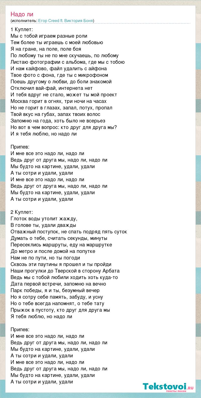 1 Куплет: Мы с тобой играем разные роли Тем более ты играешь с моей любовью Я на гране, на поле, поле боя По любому ты не по мне скучаешь, по любому Листаю фотографии с альбома, где мы с тобою И нам кайфово, файл удалить с айфона Твое фото с фона, где ты с микрофоном Поешь другому о любви, до боли знакомой Отключил вай-фай, интернета нет И тебя вдруг не стало, может ты мой проект Москва горит в огнях, три ночи на часах Но не горит в глазах, запал, потух, пропал Твой вкус на губах, запах твоих волос Запомню на года, хоть было не всерьез Но вот в чем вопрос: кто друг для друга мы? И я тебя люблю, но надо ли Припев: И мне все это надо ли, надо ли Ведь друг от друга мы, надо ли, надо ли Мы будто на картине, удали, удали А ты сотри и удали, удали И мне все это надо ли, надо ли Ведь друг от друга мы, надо ли, надо ли Мы будто на картине, удали, удали А ты сотри и удали, удали 2 Куплет: Глоток воды утолит жажду, В голове ты, удали дважды Отважный поступок, не спать подряд пять суток Думать о тебе, считать секунды, минуты Пересеклись маршруты, еду на маршрутке До метро и после домой на попутке Нам не по пути, но ты погоди Сквозь эти паутины я прошел и ты пройди Наши прогулки до Тверской в сторону Арбата Ведь мы с тобой любили ходить хоть куда-то Дата первой встречи, запомню на вечно Парк победы, я и ты, безумный вечер Но я сотру себе память, забуду, и усну Но о тебе всегда напомнят, о тебе тату Прыжок в пустоту, кто друг для друга мы Я тебя люблю, но надо ли Припев: И мне все это надо ли, надо ли Ведь друг от друга мы, надо ли, надо ли Мы будто на картине, удали, удали А ты сотри и удали, удали И мне все это надо ли, надо ли Ведь друг от друга мы, надо ли, надо ли Мы будто на картине, удали, удали А ты сотри и удали, удали