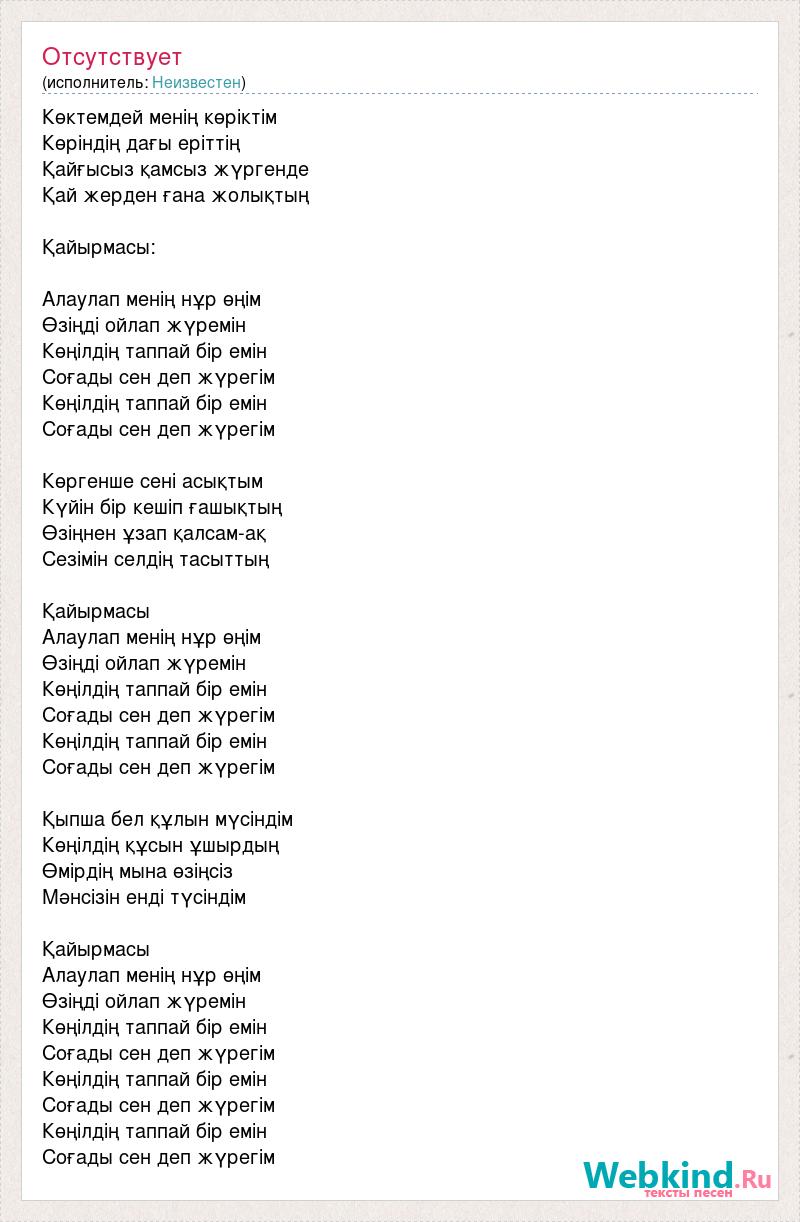 Көктемдей менің көріктім Көріндің дағы еріттің Қайғысыз қамсыз жүргенде Қай жерден ғана жолықтың Қайырмасы: Алаулап менің нұр өңім Өзіңді ойлап жүремін Көңілдің таппай бір емін Соғады сен деп жүрегім Көңілдің таппай бір емін Соғады сен деп жүрегім Көргенше сені асықтым Күйін бір кешіп ғашықтың Өзіңнен ұзап қалсам-ақ Сезімін селдің тасыттың Қайырмасы Алаулап менің нұр өңім Өзіңді ойлап жүремін Көңілдің таппай бір емін Соғады сен деп жүрегім Көңілдің таппай бір емін Соғады сен деп жүрегім Қыпша бел құлын мүсіндім Көңілдің құсын ұшырдың Өмірдің мына өзіңсіз Мәнсізін енді түсіндім Қайырмасы Алаулап менің нұр өңім Өзіңді ойлап жүремін Көңілдің таппай бір емін Соғады сен деп жүрегім Көңілдің таппай бір емін Соғады сен деп жүрегім Көңілдің таппай бір емін Соғады сен деп жүрегім