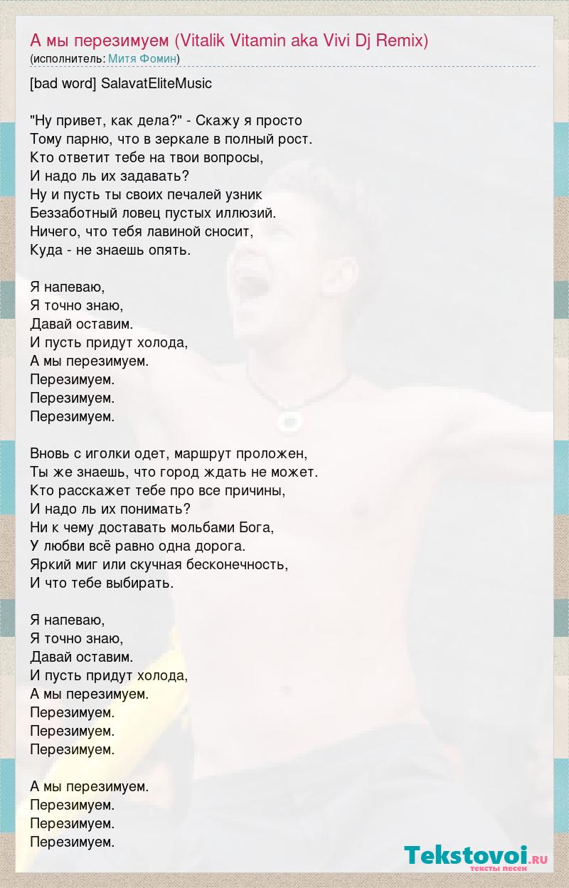 [bad word] SalavatEliteMusic "Ну привет, как дела?" - Скажу я просто Тому парню, что в зеркале в полный рост. Кто ответит тебе на твои вопросы, И надо ль их задавать? Ну и пусть ты своих печалей узник Беззаботный ловец пустых иллюзий. Ничего, что тебя лавиной сносит, Куда - не знаешь опять. Я напеваю, Я точно знаю, Давай оставим. И пусть придут холода, А мы перезимуем. Перезимуем. Перезимуем. Перезимуем. Вновь с иголки одет, маршрут проложен, Ты же знаешь, что город ждать не может. Кто расскажет тебе про все причины, И надо ль их понимать? Ни к чему доставать мольбами Бога, У любви всё равно одна дорога. Яркий миг или скучная бесконечность, И что тебе выбирать. Я напеваю, Я точно знаю, Давай оставим. И пусть придут холода, А мы перезимуем. Перезимуем. Перезимуем. Перезимуем. А мы перезимуем. Перезимуем. Перезимуем. Перезимуем.