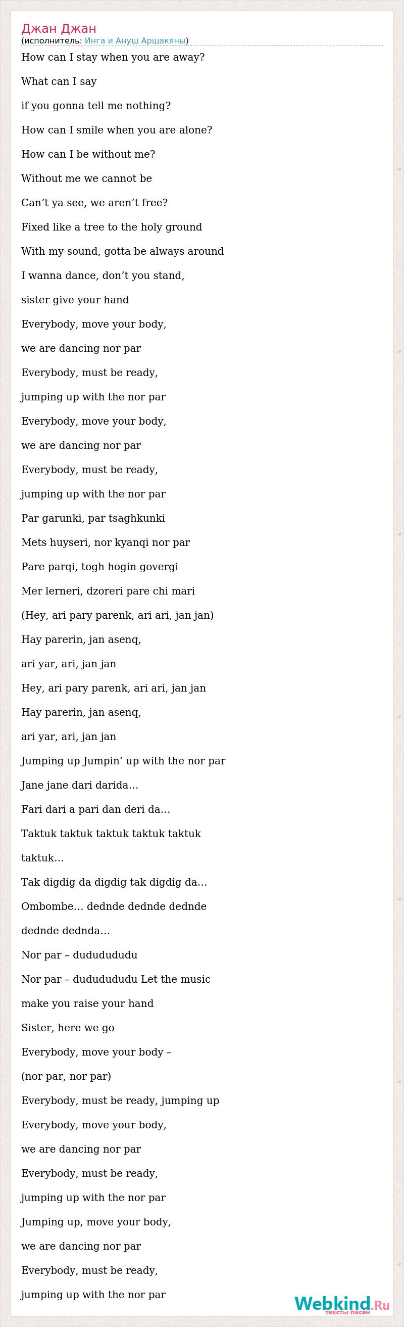 How can I stay when you are away? What can I say if you gonna tell me nothing? How can I smile when you are alone? How can I be without me? Without me we cannot be Can’t ya see, we aren’t free? Fixed like a tree to the holy ground With my sound, gotta be always around I wanna dance, don’t you stand, sister give your hand Everybody, move your body, we are dancing nor par Everybody, must be ready, jumping up with the nor par Everybody, move your body, we are dancing nor par Everybody, must be ready, jumping up with the nor par Par garunki, par tsaghkunki Mets huyseri, nor kyanqi nor par Pare parqi, togh hogin govergi Mer lerneri, dzoreri pare chi mari (Hey, ari pary parenk, ari ari, jan jan) Hay parerin, jan asenq, ari yar, ari, jan jan Hey, ari pary parenk, ari ari, jan jan Hay parerin, jan asenq, ari yar, ari, jan jan Jumping up Jumpin’ up with the nor par Jane jane dari darida… Fari dari a pari dan deri da… Taktuk taktuk taktuk taktuk taktuk taktuk… Tak digdig da digdig tak digdig da… Ombombe… dednde dednde dednde dednde dednda… Nor par – dududududu Nor par – dududududu Let the music make you raise your hand Sister, here we go Everybody, move your body – (nor par, nor par) Everybody, must be ready, jumping up Everybody, move your body, we are dancing nor par Everybody, must be ready, jumping up with the nor par Jumping up, move your body, we are dancing nor par Everybody, must be ready, jumping up with the nor par
