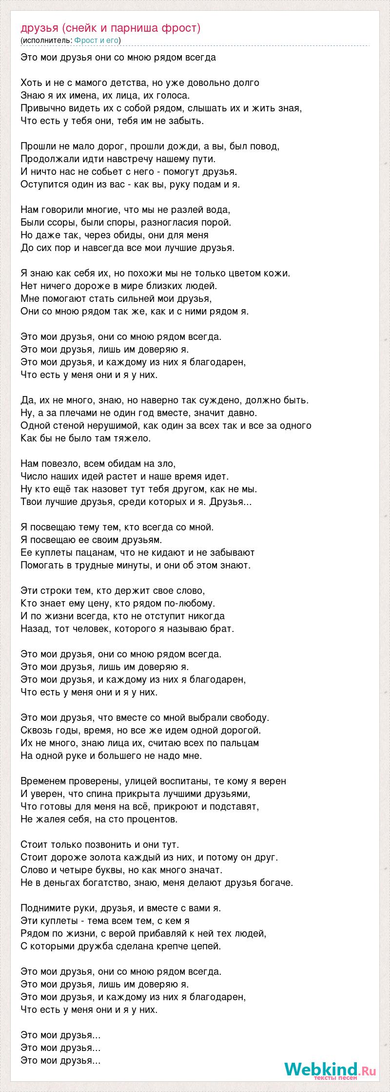 Это мои друзья они со мною рядом всегда Хоть и не с мамого детства, но уже довольно долго Знаю я их имена, их лица, их голоса. Привычно видеть их с собой рядом, слышать их и жить зная, Что есть у тебя они, тебя им не забыть. Прошли не мало дорог, прошли дожди, а вы, был повод, Продолжали идти навстречу нашему пути. И ничто нас не собьет с него - помогут друзья. Оступится один из вас - как вы, руку подам и я. Нам говорили многие, что мы не разлей вода, Были ссоры, были споры, разногласия порой. Но даже так, через обиды, они для меня До сих пор и навсегда все мои лучшие друзья. Я знаю как себя их, но похожи мы не только цветом кожи. Нет ничего дороже в мире близких людей. Мне помогают стать сильней мои друзья, Они со мною рядом так же, как и с ними рядом я. Это мои друзья, они со мною рядом всегда. Это мои друзья, лишь им доверяю я. Это мои друзья, и каждому из них я благодарен, Что есть у меня они и я у них. Да, их не много, знаю, но наверно так суждено, должно быть. Ну, а за плечами не один год вместе, значит давно. Одной стеной нерушимой, как один за всех так и все за одного Как бы не было там тяжело. Нам повезло, всем обидам на зло, Число наших идей растет и наше время идет. Ну кто ещё так назовет тут тебя другом, как не мы. Твои лучшие друзья, среди которых и я. Друзья... Я посвещаю тему тем, кто всегда со мной. Я посвещаю ее своим друзьям. Ее куплеты пацанам, что не кидают и не забывают Помогать в трудные минуты, и они об этом знают. Эти строки тем, кто держит свое слово, Кто знает ему цену, кто рядом по-любому. И по жизни всегда, кто не отступит никогда Назад, тот человек, которого я называю брат. Это мои друзья, они со мною рядом всегда. Это мои друзья, лишь им доверяю я. Это мои друзья, и каждому из них я благодарен, Что есть у меня они и я у них. Это мои друзья, что вместе со мной выбрали свободу. Сквозь годы, время, но все же идем одной дорогой. Их не много, знаю лица их, считаю всех по пальцам На одной руке и большего не надо мне. Временем проверены, улицей воспитаны, те кому я верен И уверен, что спина прикрыта лучшими друзьями, Что готовы для меня на всё, прикроют и подставят, Не жалея себя, на сто процентов. Стоит только позвонить и они тут. Стоит дороже золота каждый из них, и потому он друг. Слово и четыре буквы, но как много значат. Не в деньгах богатство, знаю, меня делают друзья богаче. Поднимите руки, друзья, и вместе с вами я. Эти куплеты - тема всем тем, с кем я Рядом по жизни, с верой прибавляй к ней тех людей, С которыми дружба сделана крепче цепей. Это мои друзья, они со мною рядом всегда. Это мои друзья, лишь им доверяю я. Это мои друзья, и каждому из них я благодарен, Что есть у меня они и я у них. Это мои друзья... Это мои друзья... Это мои друзья...