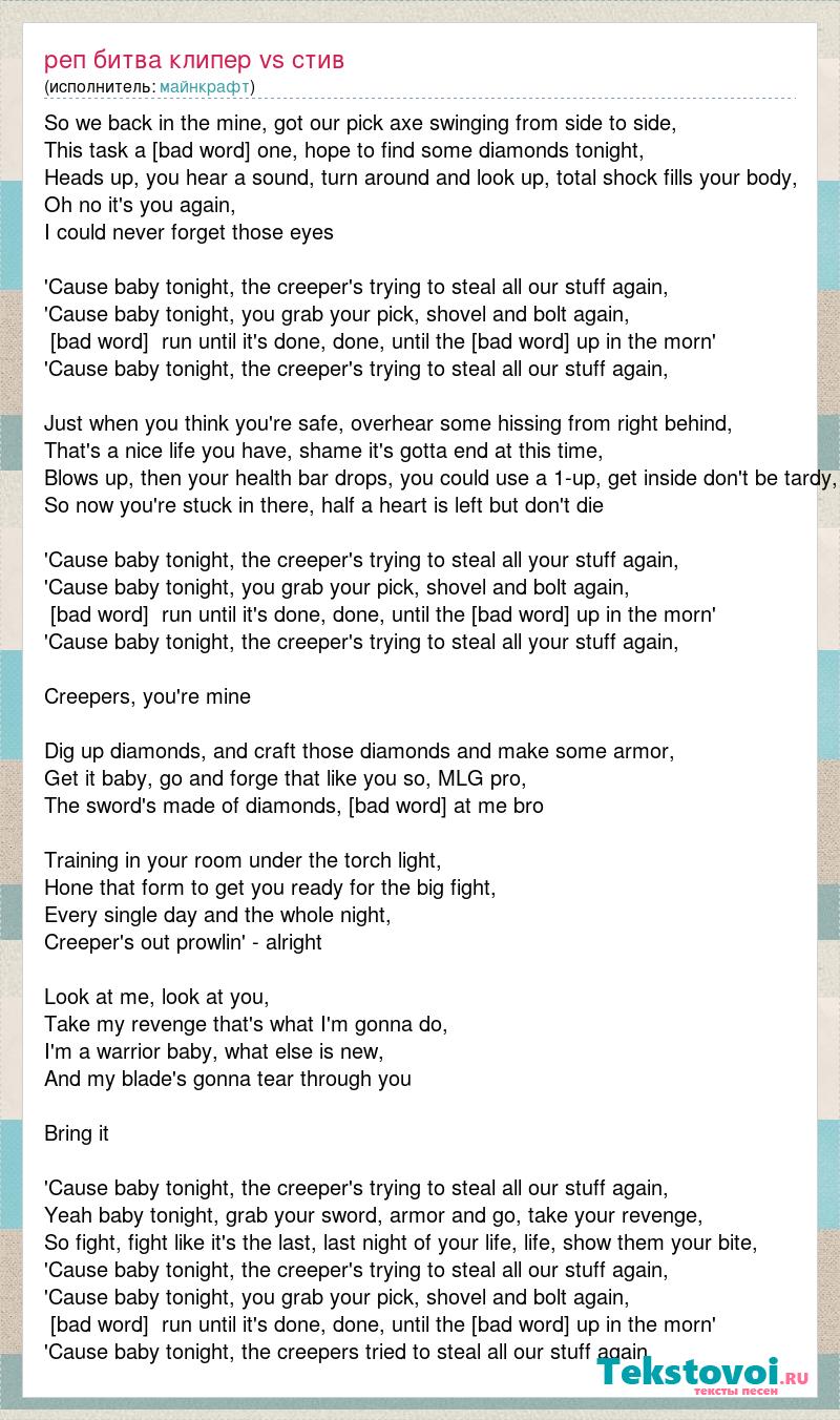 So we back in the mine, got our pick axe swinging from side to side, This task a grueling one, hope to find some diamonds tonight, Heads up, you hear a sound, turn around and look up, total shock fills your body, Oh no it's you again, I could never forget those eyes 'Cause baby tonight, the creeper's trying to steal all our stuff again, 'Cause baby tonight, you grab your pick, shovel and bolt again, And run, run until it's done, done, until the sun comes up in the morn' 'Cause baby tonight, the creeper's trying to steal all our stuff again, Just when you think you're safe, overhear some hissing from right behind, That's a nice life you have, shame it's gotta end at this time, Blows up, then your health bar drops, you could use a 1-up, get inside don't be tardy, So now you're stuck in there, half a heart is left but don't die 'Cause baby tonight, the creeper's trying to steal all your stuff again, 'Cause baby tonight, you grab your pick, shovel and bolt again, And run, run until it's done, done, until the sun comes up in the morn' 'Cause baby tonight, the creeper's trying to steal all your stuff again, Creepers, you're mine Dig up diamonds, and craft those diamonds and make some armor, Get it baby, go and forge that like you so, MLG pro, The sword's made of diamonds, so come at me bro Training in your room under the torch light, Hone that form to get you ready for the big fight, Every single day and the whole night, Creeper's out prowlin' - alright Look at me, look at you, Take my revenge that's what I'm gonna do, I'm a warrior baby, what else is new, And my blade's gonna tear through you Bring it 'Cause baby tonight, the creeper's trying to steal all our stuff again, Yeah baby tonight, grab your sword, armor and go, take your revenge, So fight, fight like it's the last, last night of your life, life, show them your bite, 'Cause baby tonight, the creeper's trying to steal all our stuff again, 'Cause baby tonight, you grab your pick, shovel and bolt again, And run, run until it's done, done, until the sun comes up in the morn' 'Cause baby tonight, the creepers tried to steal all our stuff again