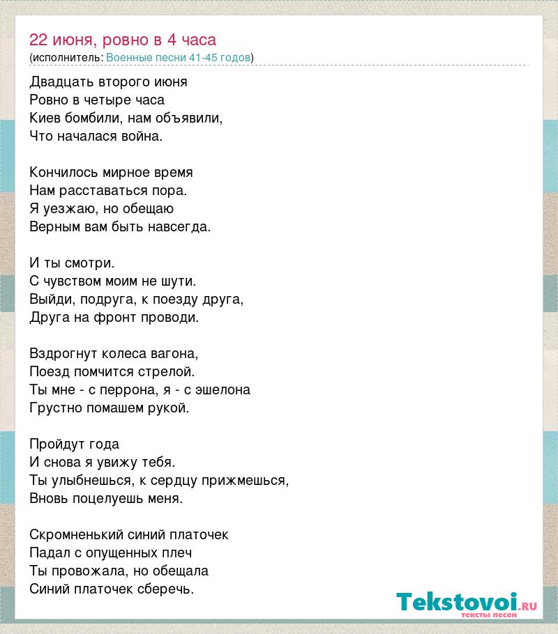Двадцать второго июня Ровно в четыре часа Киев бомбили, нам объявили, Что началася война. Кончилось мирное время Нам расставаться пора. Я уезжаю, но обещаю Верным вам быть навсегда. И ты смотри. С чувством моим не шути. Выйди, подруга, к поезду друга, Друга на фронт проводи. Вздрогнут колеса вагона, Поезд помчится стрелой. Ты мне - с перрона, я - с эшелона Грустно помашем рукой. Пройдут года И снова я увижу тебя. Ты улыбнешься, к сердцу прижмешься, Вновь поцелуешь меня. Скромненький синий платочек Падал с опущенных плеч Ты провожала, но обещала Синий платочек сберечь.