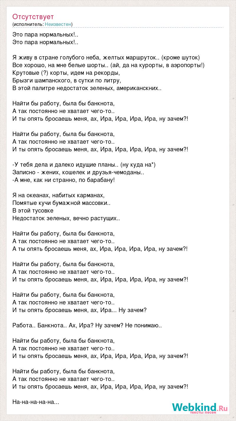 Это пара нормальных!.. Это пара нормальных!.. Я живу в стране голубого неба, желтых маршруток.. (кроме шуток) Все хорошо, на мне белые шорты.. (ай, да на курорты, в аэропорты!) Крутовые (?) корты, идем на рекорды, Брызги шампанского, в сутки по литру, В этой палитре недостаток зеленых, американскних.. Найти бы работу, была бы банкнота, А так постоянно не хватает чего-то.. И ты опять бросаешь меня, ах, Ира, Ира, Ира, Ира, ну зачем?! Найти бы работу, была бы банкнота, А так постоянно не хватает чего-то.. И ты опять бросаешь меня, ах, Ира, Ира, Ира, Ира, ну зачем?! -У тебя дела и далеко идущие планы.. (ну куда на*) Записно - жених, кошелек и друзья-чемоданы.. -А мне, как ни странно, по барабану! Я на океанах, набитых карманах, Помятые кучи бумажной массовки.. В этой тусовке Недостаток зеленых, вечно растущих.. Найти бы работу, была бы банкнота, А так постоянно не хватает чего-то.. А ты опять бросаешь меня, ах, Ира, Ира, Ира, Ира, ну зачем?! Найти бы работу, была бы банкнота, А так постоянно не хватает чего-то.. И ты опять бросаешь меня, ах, Ира, Ира, Ира, Ира, ну зачем?! Найти бы работу, была бы банкнота, А так постоянно не хватает чего-то.. И ты опять бросаешь меня, ах, Ира... Ну зачем? Работа.. Банкнота.. Ах, Ира? Ну зачем? Не понимаю.. Найти бы работу, была бы банкнота, А так постоянно не хватает чего-то.. И ты опять бросаешь меня, ах, Ира, Ира, Ира, Ира, ну зачем?! Найти бы работу, была бы банкнота, А так постоянно не хватает чего-то.. И ты опять бросаешь меня, ах, Ира, Ира, Ира, Ира, ну зачем?! На-на-на-на-на...