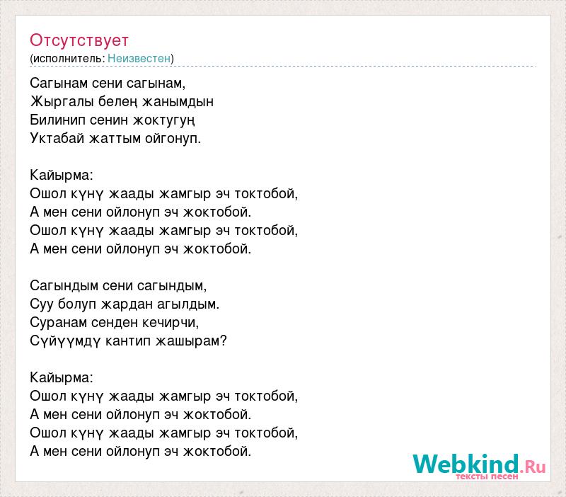 Сагынам сени сагынам, Жыргалы белең жанымдын Билинип сенин жоктугуң Уктабай жаттым ойгонуп. Кайырма: Ошол күнү жаады жамгыр эч токтобой, А мен сени ойлонуп эч жоктобой. Ошол күнү жаады жамгыр эч токтобой, А мен сени ойлонуп эч жоктобой. Сагындым сени сагындым, Суу болуп жардан агылдым. Суранам сенден кечирчи, Сүйүүмдү кантип жашырам? Кайырма: Ошол күнү жаады жамгыр эч токтобой, А мен сени ойлонуп эч жоктобой. Ошол күнү жаады жамгыр эч токтобой, А мен сени ойлонуп эч жоктобой.