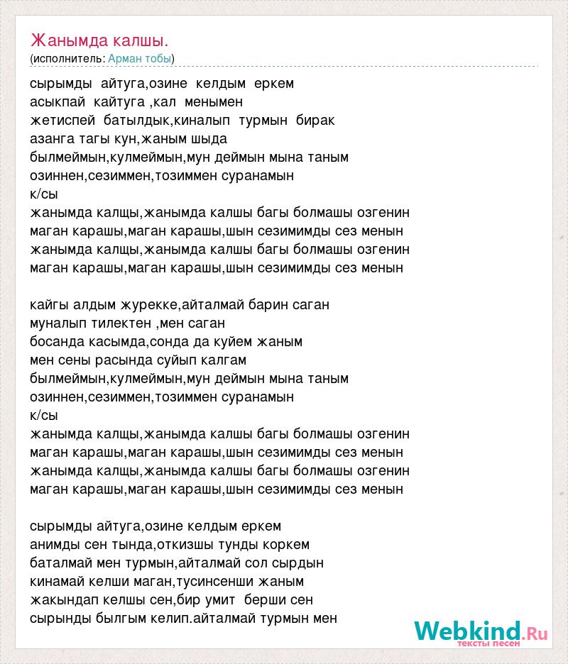 сырымды айтуга,озине келдым еркем асыкпай кайтуга ,кал менымен жетиспей батылдык,киналып турмын бирак азанга тагы кун,жаным шыда былмеймын,кулмеймын,мун деймын мына таным озиннен,сезиммен,тозиммен суранамын к/сы жанымда калщы,жанымда калшы багы болмашы озгенин маган карашы,маган карашы,шын сезимимды сез менын жанымда калщы,жанымда калшы багы болмашы озгенин маган карашы,маган карашы,шын сезимимды сез менын кайгы алдым журекке,айталмай барин саган муналып тилектен ,мен саган босанда касымда,сонда да куйем жаным мен сены расында суйып калгам былмеймын,кулмеймын,мун деймын мына таным озиннен,сезиммен,тозиммен суранамын к/сы жанымда калщы,жанымда калшы багы болмашы озгенин маган карашы,маган карашы,шын сезимимды сез менын жанымда калщы,жанымда калшы багы болмашы озгенин маган карашы,маган карашы,шын сезимимды сез менын сырымды айтуга,озине келдым еркем анимды сен тында,откизшы тунды коркем баталмай мен турмын,айталмай сол сырдын кинамай келши маган,тусинсенши жаным жакындап келшы сен,бир умит берши сен сырынды былгым келип.айталмай турмын мен