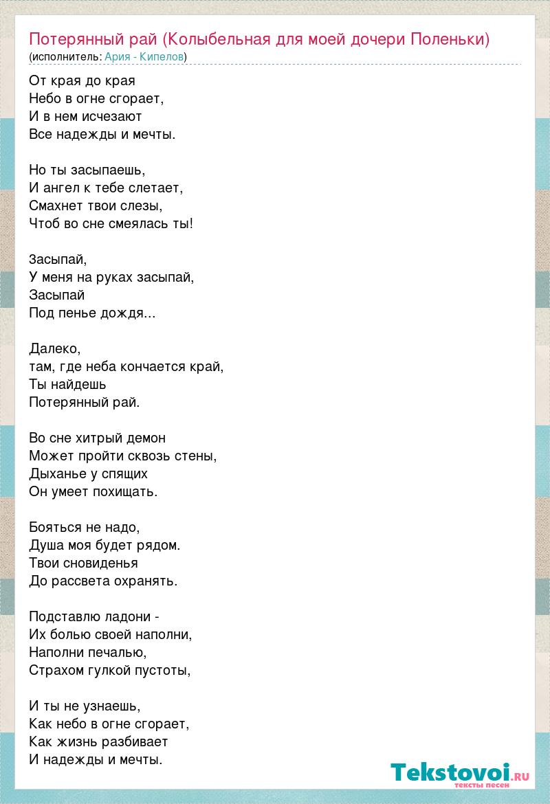 От края до края Небо в огне сгорает, И в нем исчезают Все надежды и мечты. Но ты засыпаешь, И ангел к тебе слетает, Смахнет твои слезы, Чтоб во сне смеялась ты! 3асыпай, У меня на руках засыпай, Засыпай Под пенье дождя... Далеко, там, где неба кончается край, Ты найдешь Потерянный рай. Во сне хитрый демон Может пройти сквозь стены, Дыханье у спящих Он умеет похищать. Бояться не надо, Душа моя будет рядом. Твои сновиденья До рассвета охранять. Подставлю ладони - Их болью своей наполни, Наполни печалью, Страхом гулкой пустоты, И ты не узнаешь, Как небо в огне сгорает, Как жизнь разбивает И надежды и мечты.