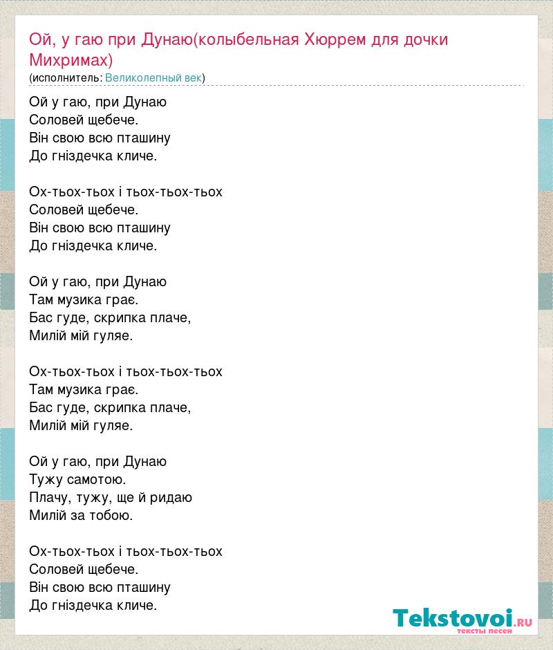 Ой у гаю, при Дунаю Соловей щебече. Він свою всю пташину До гніздечка кличе. Ох-тьох-тьох і тьох-тьох-тьох Соловей щебече. Він свою всю пташину До гніздечка кличе. Ой у гаю, при Дунаю Там музика грає. Бас гуде, скрипка плаче, Милiй мій гуляе. Ох-тьох-тьох і тьох-тьох-тьох Там музика грає. Бас гуде, скрипка плаче, Милiй мiй гуляе. Ой у гаю, при Дунаю Тужу самотою. Плачу, тужу, ще й ридаю Милiй за тобою. Ох-тьох-тьох і тьох-тьох-тьох Соловей щебече. Він свою всю пташину До гніздечка кличе.