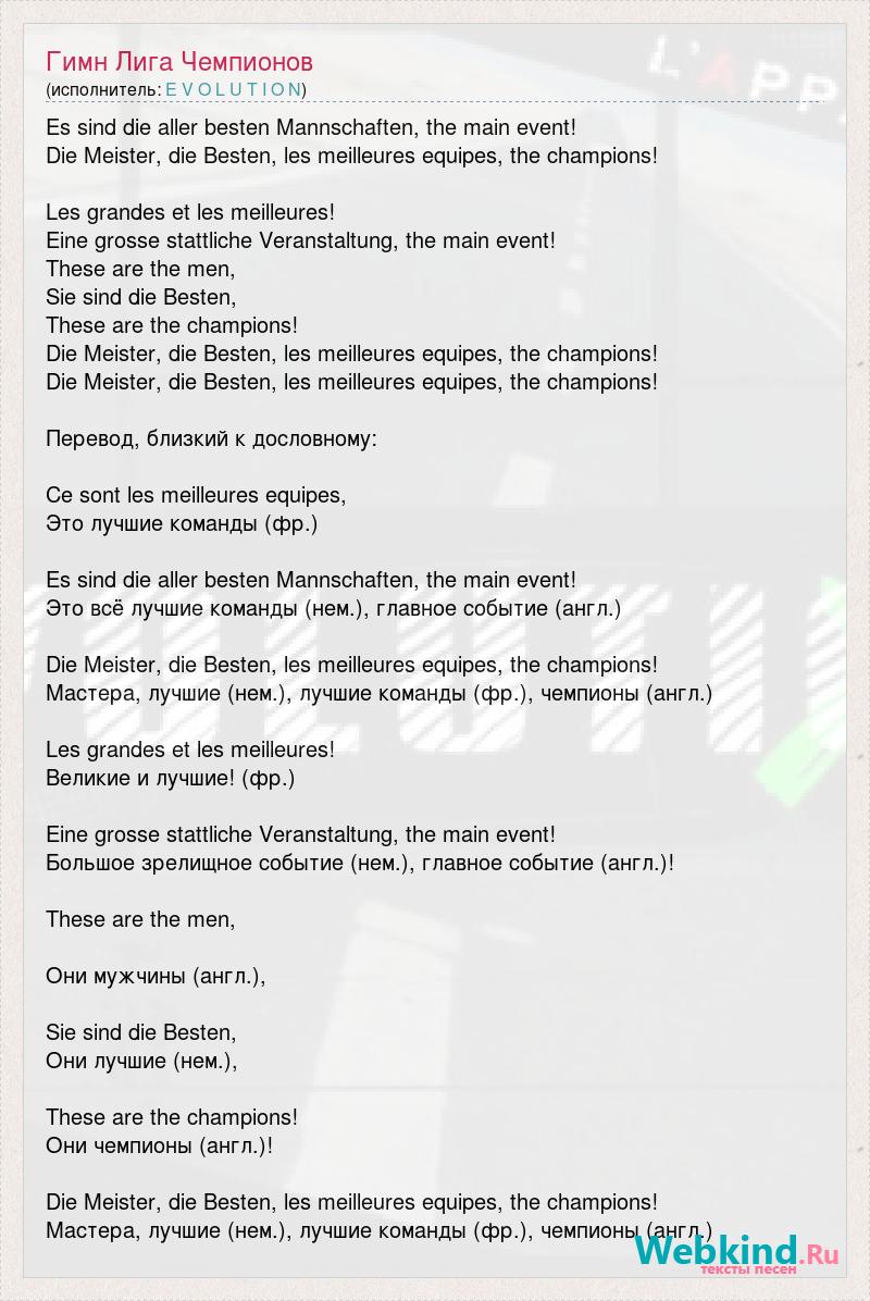Es sind die aller besten Mannschaften, the main event! Die Meister, die Besten, les meilleures equipes, the champions! Les grandes et les meilleures! Eine grosse stattliche Veranstaltung, the main event! These are the men, Sie sind die Besten, These are the champions! Die Meister, die Besten, les meilleures equipes, the champions! Die Meister, die Besten, les meilleures equipes, the champions! Перевод, близкий к дословному: Ce sont les meilleures equipes, Это лучшие команды (фр.) Es sind die aller besten Mannschaften, the main event! Это всё лучшие команды (нем.), главное событие (англ.) Die Meister, die Besten, les meilleures equipes, the champions! Мастера, лучшие (нем.), лучшие команды (фр.), чемпионы (англ.) Les grandes et les meilleures! Великие и лучшие! (фр.) Eine grosse stattliche Veranstaltung, the main event! Большое зрелищное событие (нем.), главное событие (англ.)! These are the men, Они мужчины (англ.), Sie sind die Besten, Они лучшие (нем.), These are the champions! Они чемпионы (англ.)! Die Meister, die Besten, les meilleures equipes, the champions! Мастера, лучшие (нем.), лучшие команды (фр.), чемпионы (англ.)
