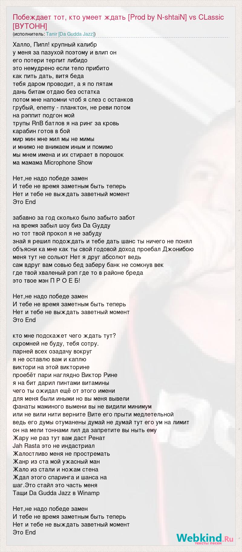 Халло, Пипл! крупный калибр у меня за пазухой поэтому и влип он его потери терпит либидо это немудрено если тело прибито как пить дать, витя беда тебя даром проводит, а я по пятам дань битам отдаю без остатка потом мне напомни чтоб я слез с останков грубый, enemy - планктон, не реви потом на рэппит подгон мой трупы RnB батлов я на ринг за кровь карабин готов в бой мир мин мне мил мы не мимы и мнимо не внимаем иным и помимо мы мнем имена и их стирает в порошок ма мамама Microphone Show Нет,не надо победе замен И тебе не время заметным быть теперь Нет и тебе не выждать заветный момент Это End забавно за год сколько было забыто забот на время забыл шоу биз Dа Gудду но тот твой прокол я не забуду знай я решил подождать и тебе дать шанс ты ничего не понял объясни ка мне как ты свой годовой доход проебал Джонибою меня тут не сольют Нет я друг абсолют ведь сам вдруг вам совью бед заберу банк не сомкнув век где твой хваленый рэп где то в районе бреда это твое мэн П Р О Е Б! Нет,не надо победе замен И тебе не время заметным быть теперь Нет и тебе не выждать заветный момент Это End кто мне подскажет чего ждать тут? скромней не буду, тебя сотру. парней всех озадачу вокруг я не оставлю вам и каплю виктори на этой викторине проебёт пари наглядно Виктор Рине я на бит дарил пинтами витамины чего ты ожидал ещё от этого имени для меня были иными но вы меня вывели фанаты маминого вымени вы не видили минимум или не вили нити верните Вите его прыти медлетельной ведь его думы отуманены думай не думай тут его ум на лимит он на мели тоннами лил да запретите вы ныть ему Жару не раз тут вам даст Ренат Jah Rasta это не индастриал Жалостливо меня не простремать Жанр из ста мой ужасный ман Жало из стали и ножам стена Ждал этого спаринга и шанса на шаг.Это стайл это часть меня Тащи Da Gudda Jazz в Winamp Нет,не надо победе замен И тебе не время заметным быть теперь Нет и тебе не выждать заветный момент Это End
