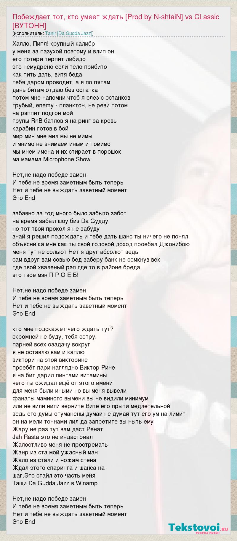 Главная→Исполнители→Tanir [Da Gudda Jazz]→Побеждает тот, кто умеет ждать [Prod by N-shtaiN] vs CLassic [ВУТОНН]
