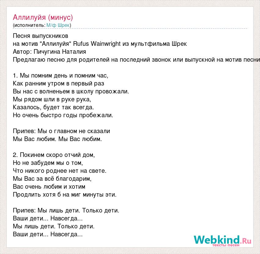 Песня выпускников на мотив "Аллилуйя" Rufus Wainwright из мультфильма Шрек Автор: Пичугина Наталия Предлагаю песню для родителей на последний звонок или выпускной на мотив песни 1. Мы помним день и помним час, Как ранним утром в первый раз Вы нас с волненьем в школу провожали. Мы рядом шли в руке рука, Казалось, будет так всегда. Но очень быстро годы пробежали. Припев: Мы о главном не сказали Мы Вас любим. Мы Вас любим. 2. Покинем скоро отчий дом, Но не забудем мы о том, Что никого роднее нет на свете. Мы Вас за всё благодарим, Вас очень любим и хотим Продлить хотя б на миг минуты эти. Припев: Мы лишь дети. Только дети. Ваши дети... Навсегда... Мы лишь дети. Только дети. Ваши дети... Навсегда...