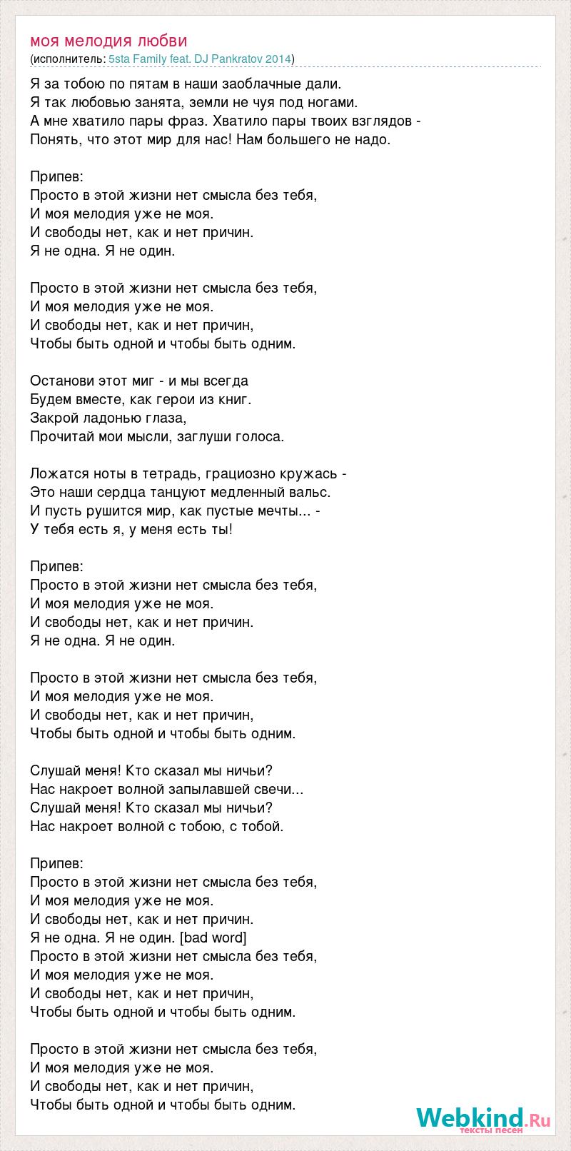 Я за тобою по пятам в наши заоблачные дали. Я так любовью занята, земли не чуя под ногами. А мне хватило пары фраз. Хватило пары твоих взглядов - Понять, что этот мир для нас! Нам большего не надо. Припев: Просто в этой жизни нет смысла без тебя, И моя мелодия уже не моя. И свободы нет, как и нет причин. Я не одна. Я не один. Просто в этой жизни нет смысла без тебя, И моя мелодия уже не моя. И свободы нет, как и нет причин, Чтобы быть одной и чтобы быть одним. Останови этот миг - и мы всегда Будем вместе, как герои из книг. Закрой ладонью глаза, Прочитай мои мысли, заглуши голоса. Ложатся ноты в тетрадь, грациозно кружась - Это наши сердца танцуют медленный вальс. И пусть рушится мир, как пустые мечты... - У тебя есть я, у меня есть ты! Припев: Просто в этой жизни нет смысла без тебя, И моя мелодия уже не моя. И свободы нет, как и нет причин. Я не одна. Я не один. Просто в этой жизни нет смысла без тебя, И моя мелодия уже не моя. И свободы нет, как и нет причин, Чтобы быть одной и чтобы быть одним. Слушай меня! Кто сказал мы ничьи? Нас накроет волной запылавшей свечи... Слушай меня! Кто сказал мы ничьи? Нас накроет волной с тобою, с тобой. Припев: Просто в этой жизни нет смысла без тебя, И моя мелодия уже не моя. И свободы нет, как и нет причин. Я не одна. Я не один. [bad word] Просто в этой жизни нет смысла без тебя, И моя мелодия уже не моя. И свободы нет, как и нет причин, Чтобы быть одной и чтобы быть одним. Просто в этой жизни нет смысла без тебя, И моя мелодия уже не моя. И свободы нет, как и нет причин, Чтобы быть одной и чтобы быть одним.