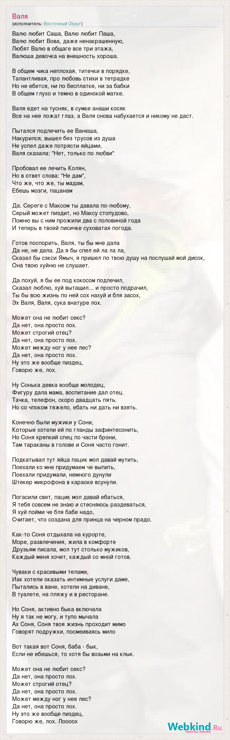 Валю любит Саша, Валю любит Паша, Валю любит Вова, даже ненакрашенную, Любят Валю в общаге все три этажа, Валюша девочка на внешность хороша. В общем чика неплохая, титечки в порядке, Талантливая, про любовь стихи в тетрадке Но не ебется, ни по бесплатке, ни за бабки В общем глухо и темно в одинокой матке. Валя едет на тусняк, в сумке анаши косяк Все на нее ложат глаз, а Валя снова набухается и никому не даст. Пытался подлечить ее Ванюша, Накурился, вышел без трусов из душа Не успел даже потрясти яйцами, Валя сказала: "Нет, только по любви" Пробовал ее лечить Колян, Но в ответ слова: "Не дам", Что же, что же, ты мадам, Ебешь мозги, пацанам Да. Сереге с Максом ты давала по-любому, Серый может пиздит, но Максу стопудово, Помню вы с ним прожили два с половиной года И теперь в твоей писичке суховатая погода. Готов поспорить, Валя, ты бы мне дала Да не, не дала. Да я бы спел ей ла ла ла, Сказал бы сэкси Ямыч, я пришел по твою душу на послушай мой дисок, Она твою хуйню не слушает. Да похуй, я бы ее под кокосом подлечил, Сказал люблю, хуй вытащил... и просто подрачил, Ты бы всю жизнь по ней сох нахуй и бля засох, Эх Валя, Валя, сука внатуре лох. Может она не любит секс? Да нет, она просто лох. Может строгий отец? Да нет, она просто лох. Может между ног у нее лес? Да нет, она просто лох. Ну это же вообще пиздец, Говорю же, лох. Ну Сонька девка вообще молодец, Фигуру дала мама, воспитание дал отец. Тачка, телефон, скоро двадцать пять. Но со чпоком тяжело, ебать ни дать ни взять. Конечно были мужики у Сони, Которые хотели ей по гланды зафинтесонить, Но Соня крепкий спец по части брони, Там тараканы в голове и Соня часто гонит. Подкатывал тут яйца пацик мол давай мутить, Поехали ко мне придумаем че выпить, Поехали придумали, немного дунули Штекер микрофона в караоке всунули. Погасили свет, пацик мол давай ебаться, Я тебя совсем не знаю и стесняюсь раздеваться, Я хуй пойми че бля бабе надо, Считает, что создана для принца на черном прадо. Как-то Соня отдыхала на курорте, Море, развлечения, жила в комфорте Друзьям писала, мол тут столько мужиков, Каждый меня хочет, каждый со мной готов. Чуваки с красивыми телами, Иак хотели оказать интимные услуги даме, Пытались в ване, хотели на диване, В туалете, на пляжу и в ресторане. Но Соня, активно быка включала Ну я так не могу, и тупо мычала Ах Соня, Соня твоя жизнь проходит мимо Говорят подружки, посмеиваясь мило Вот такая вот Соня, баба - бык, Если не ебешься, то хотя бы возьми на клык. Может она не любит секс? Да нет, она просто лох. Может строгий отец? Да нет, она просто лох. Может между ног у нее лес? Да нет, она просто лох. Ну это же вообще пиздец, Говорю же, лох. Лоооох