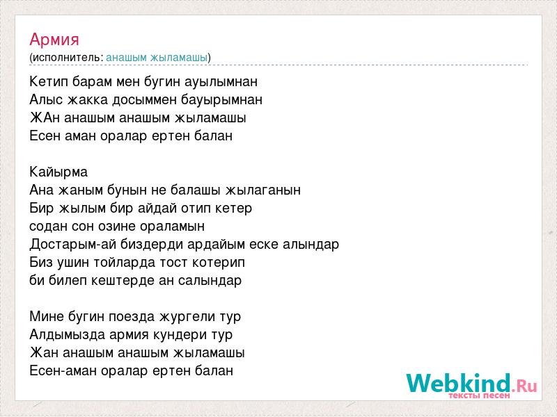 Кетип барам мен бугин ауылымнан Алыс жакка досыммен бауырымнан ЖАн анашым анашым жыламашы Есен аман оралар ертен балан Кайырма Ана жаным бунын не балашы жылаганын Бир жылым бир айдай отип кетер содан сон озине ораламын Достарым-ай биздерди ардайым еске алындар Биз ушин тойларда тост котерип би билеп кештерде ан салындар Мине бугин поезда жургели тур Алдымызда армия кундери тур Жан анашым анашым жыламашы Есен-аман оралар ертен балан