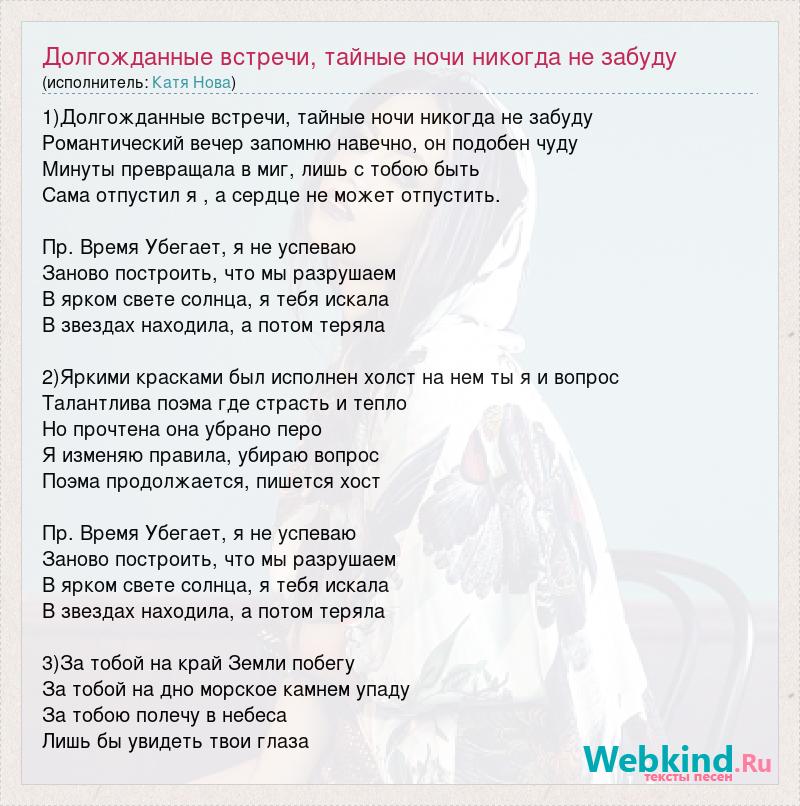 1)Долгожданные встречи, тайные ночи никогда не забуду Романтический вечер запомню навечно, он подобен чуду Минуты превращала в миг, лишь с тобою быть Сама отпустил я , а сердце не может отпустить. Пр. Время Убегает, я не успеваю Заново построить, что мы разрушаем В ярком свете солнца, я тебя искала В звездах находила, а потом теряла 2)Яркими красками был исполнен холст на нем ты я и вопрос Талантлива поэма где страсть и тепло Но прочтена она убрано перо Я изменяю правила, убираю вопрос Поэма продолжается, пишется хост Пр. Время Убегает, я не успеваю Заново построить, что мы разрушаем В ярком свете солнца, я тебя искала В звездах находила, а потом теряла 3)За тобой на край Земли побегу За тобой на дно морское камнем упаду За тобою полечу в небеса Лишь бы увидеть твои глаза