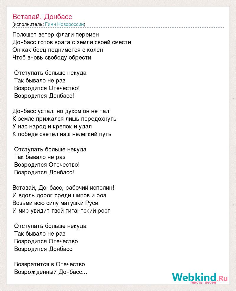 Полощет ветер флаги перемен Донбасс готов врага с земли своей смести Он как боец поднимется с колен Чтоб вновь свободу обрести Отступать больше некуда Так бывало не раз Возродится Отечество! Возродится Донбасс! Донбасс устал, но духом он не пал К земле прижался лишь передохнуть У нас народ и крепок и удал К победе светел наш нелегкий путь Отступать больше некуда Так бывало не раз Возродится Отечество! Возродится Донбасс! Вставай, Донбасс, рабочий исполин! И вдоль дорог среди шипов и роз Возьми всю силу матушки Руси И мир увидит твой гигантский рост Отступать больше некуда Так бывало не раз Возродится Отечество Возродится Донбасс Возвратится в Отечество Возрожденный Донбасс...