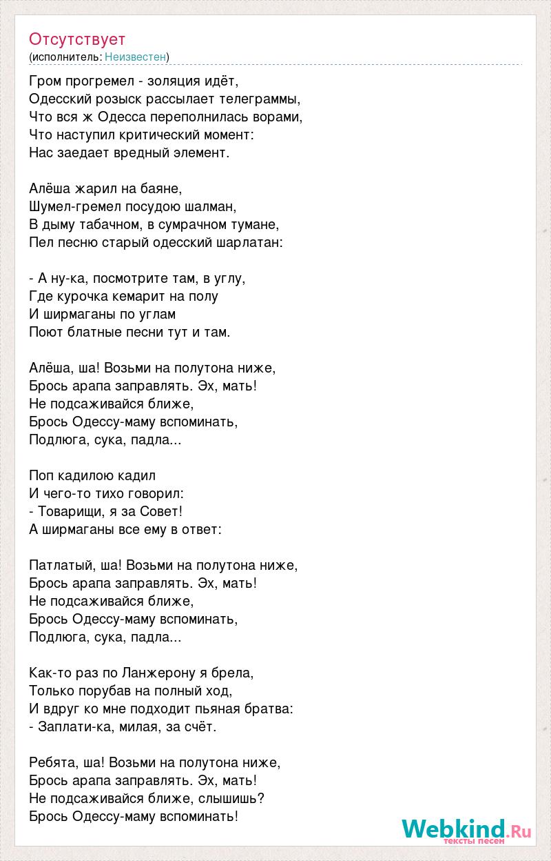Гром прогремел - золяция идёт, Одесский розыск рассылает телеграммы, Что вся ж Одесса переполнилась ворами, Что наступил критический момент: Нас заедает вредный элемент. Алёша жарил на баяне, Шумел-гремел посудою шалман, В дыму табачном, в сумрачном тумане, Пел песню старый одесский шарлатан: - А ну-ка, посмотрите там, в углу, Где курочка кемарит на полу И ширмаганы по углам Поют блатные песни тут и там. Алёша, ша! Возьми на полутона ниже, Брось арапа заправлять. Эх, мать! Не подсаживайся ближе, Брось Одессу-маму вспоминать, Подлюга, сука, падла... Поп кадилою кадил И чего-то тихо говорил: - Товарищи, я за Совет! А ширмаганы все ему в ответ: Патлатый, ша! Возьми на полутона ниже, Брось арапа заправлять. Эх, мать! Не подсаживайся ближе, Брось Одессу-маму вспоминать, Подлюга, сука, падла... Как-то раз по Ланжерону я брела, Только порубав на полный ход, И вдруг ко мне подходит пьяная братва: - Заплати-ка, милая, за счёт. Ребята, ша! Возьми на полутона ниже, Брось арапа заправлять. Эх, мать! Не подсаживайся ближе, слышишь? Брось Одессу-маму вспоминать!