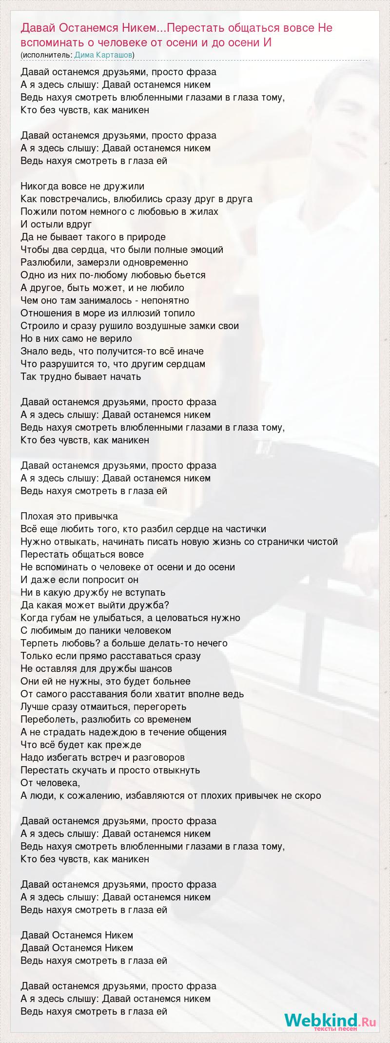 Главная→Исполнители→Дима Карташов→Давай Останемся Никем...Перестать общаться вовсе Не вспоминать о человеке от о