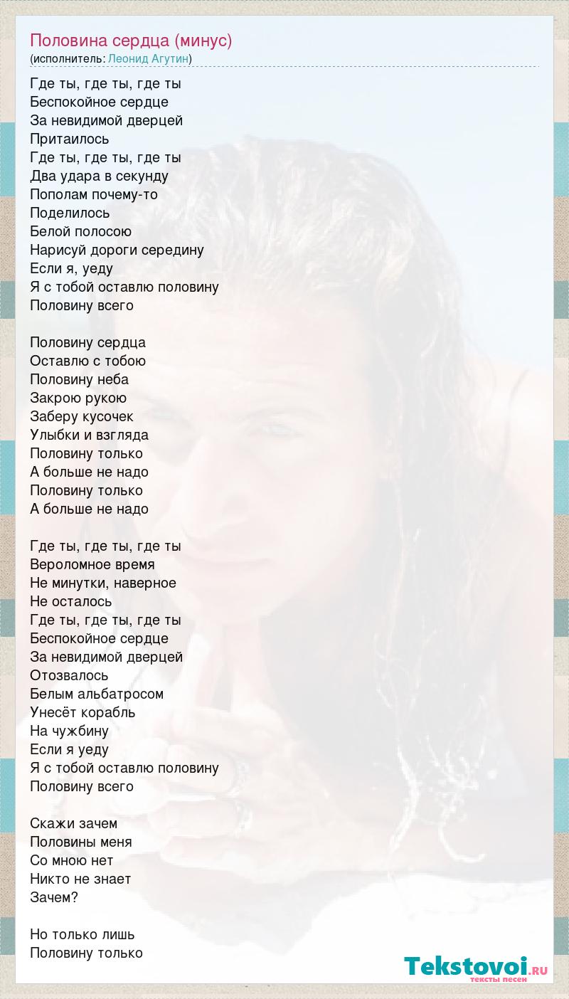 Где ты, где ты, где ты Беспокойное сердце За невидимой дверцей Притаилось Где ты, где ты, где ты Два удара в секунду Пополам почему-то Поделилось Белой полосою Нарисуй дороги середину Если я, уеду Я с тобой оставлю половину Половину всего Половину сердца Оставлю с тобою Половину неба Закрою рукою Заберу кусочек Улыбки и взгляда Половину только А больше не надо Половину только А больше не надо Где ты, где ты, где ты Вероломное время Не минутки, наверное Не осталось Где ты, где ты, где ты Беспокойное сердце За невидимой дверцей Отозвалось Белым альбатросом Унесёт корабль На чужбину Если я уеду Я с тобой оставлю половину Половину всего Скажи зачем Половины меня Со мною нет Никто не знает Зачем? Но только лишь Половину только