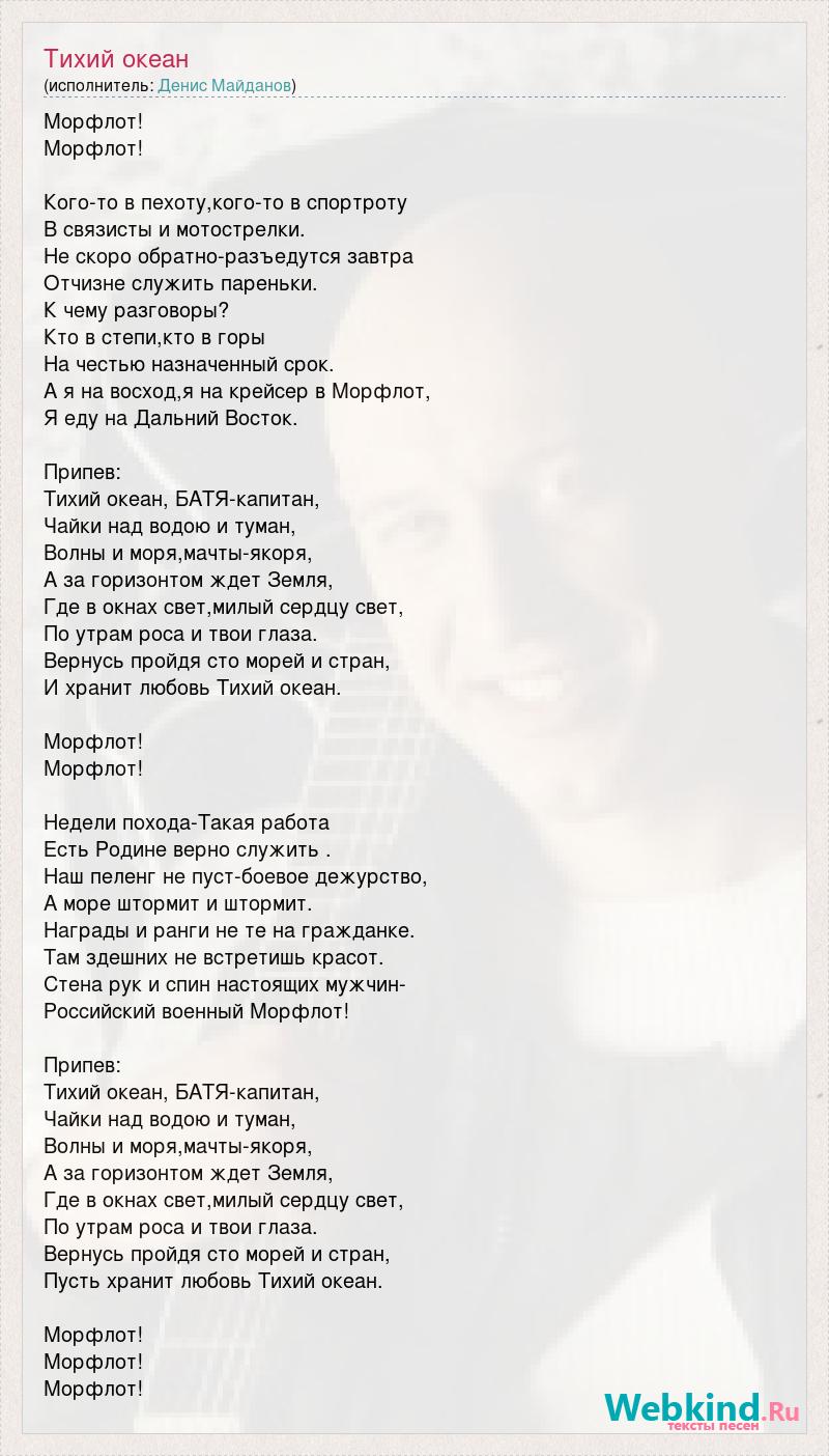 Морфлот! Морфлот! Кого-то в пехоту,кого-то в спортроту В связисты и мотострелки. Не скоро обратно-разъедутся завтра Отчизне служить пареньки. К чему разговоры? Кто в степи,кто в горы На честью назначенный срок. А я на восход,я на крейсер в Морфлот, Я еду на Дальний Восток. Припев: Тихий океан, БАТЯ-капитан, Чайки над водою и туман, Волны и моря,мачты-якоря, А за горизонтом ждет Земля, Где в окнах свет,милый сердцу свет, По утрам роса и твои глаза. Вернусь пройдя сто морей и стран, И хранит любовь Тихий океан. Морфлот! Морфлот! Недели похода-Такая работа Есть Родине верно служить . Наш пеленг не пуст-боевое дежурство, А море штормит и штормит. Награды и ранги не те на гражданке. Там здешних не встретишь красот. Стена рук и спин настоящих мужчин- Российский военный Морфлот! Припев: Тихий океан, БАТЯ-капитан, Чайки над водою и туман, Волны и моря,мачты-якоря, А за горизонтом ждет Земля, Где в окнах свет,милый сердцу свет, По утрам роса и твои глаза. Вернусь пройдя сто морей и стран, Пусть хранит любовь Тихий океан. Морфлот! Морфлот! Морфлот!