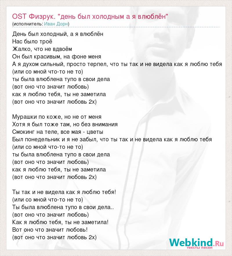 День был холодный, а я влюблён Нас было троё Жалко, что не вдвоём Он был красивым, на фоне меня А я духом сильный, просто терпел, что ты так и не видела как я люблю тебя (или со мной что-то не то) ты была влюблена тупо в свои дела (вот оно что значит любовь) как я люблю тебя, ты не заметила (вот оно что значит любовь 2х) Мурашки по коже, но не от меня Хотя я был тоже там, но без внимания Смокинг на теле, все мая - цветы Был понедельник и я не забыл, что ты так и не видела как я люблю тебя (или со мной что-то не то) ты была влюблена тупо в свои дела (вот оно что значит любовь) как я люблю тебя, ты не заметила (вот оно что значит любовь 2х) Ты так и не видела как я люблю тебя! (или со мной что-то не то) Ты была влюблена тупо в свои дела.. (вот оно что значит любовь) Как я люблю тебя, ты не заметила! Вот оно что значит любовь! (вот оно что значит любовь 2х)