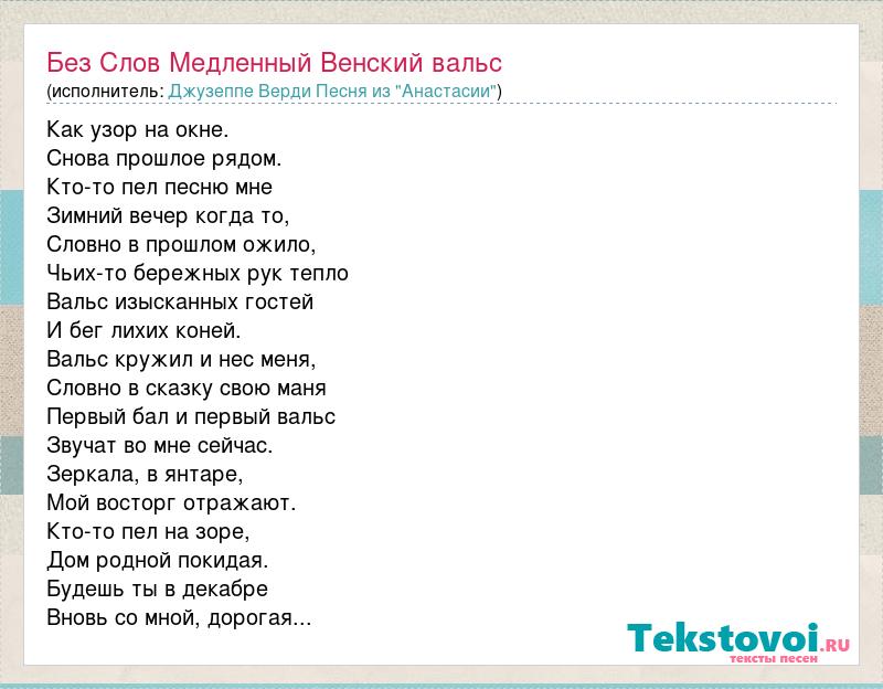 Как узор на окне. Снова прошлое рядом. Кто-то пел песню мне Зимний вечер когда то, Словно в прошлом ожило, Чьих-то бережных рук тепло Вальс изысканных гостей И бег лихих коней. Вальс кружил и нес меня, Словно в сказку свою маня Первый бал и первый вальс Звучат во мне сейчас. Зеркала, в янтаре, Мой восторг отражают. Кто-то пел на зоре, Дом родной покидая. Будешь ты в декабре Вновь со мной, дорогая...