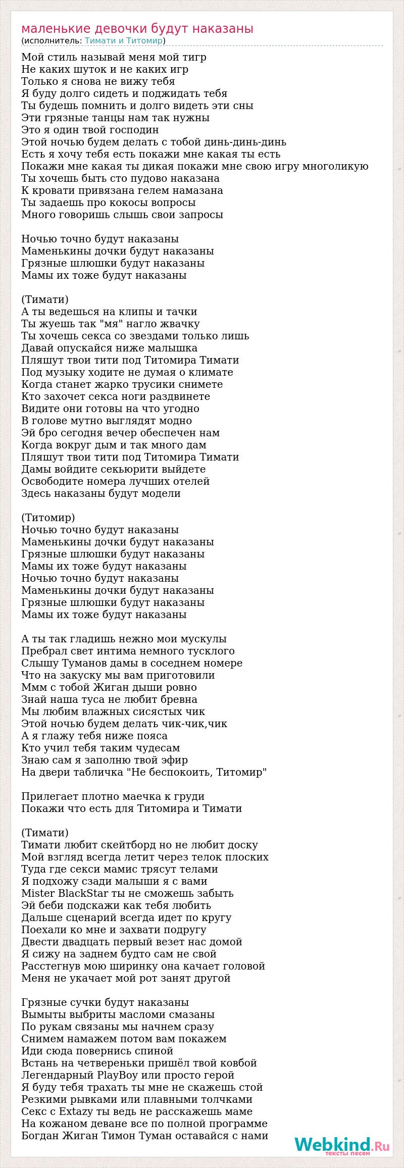 Мой стиль называй меня мой тигр Не каких шуток и не каких игр Только я снова не вижу тебя Я буду долго сидеть и поджидать тебя Ты будешь помнить и долго видеть эти сны Эти грязные танцы нам так нужны Это я один твой господин Этой ночью будем делать с тобой динь-динь-динь Есть я хочу тебя есть покажи мне какая ты есть Покажи мне какая ты дикая покажи мне свою игру многоликую Ты хочешь быть сто пудово наказана К кровати привязана гелем намазана Ты задаешь про кокосы вопросы Много говоришь слышь свои запросы Ночью точно будут наказаны Маменькины дочки будут наказаны Грязные шлюшки будут наказаны Мамы их тоже будут наказаны (Тимати) А ты ведешься на клипы и тачки Ты жуешь так "мя" нагло жвачку Ты хочешь секса со звездами только лишь Давай опускайся ниже малышка Пляшут твои тити под Титомира Тимати Под музыку ходите не думая о климате Когда станет жарко трусики снимете Кто захочет секса ноги раздвинете Видите они готовы на что угодно В голове мутно выглядят модно Эй бро сегодня вечер обеспечен нам Когда вокруг дым и так много дам Пляшут твои тити под Титомира Тимати Дамы войдите секьюрити выйдете Освободите номера лучших отелей Здесь наказаны будут модели (Титомир) Ночью точно будут наказаны Маменькины дочки будут наказаны Грязные шлюшки будут наказаны Мамы их тоже будут наказаны Ночью точно будут наказаны Маменькины дочки будут наказаны Грязные шлюшки будут наказаны Мамы их тоже будут наказаны А ты так гладишь нежно мои мускулы Пребрал свет интима немного тусклого Слышу Туманов дамы в соседнем номере Что на закуску мы вам приготовили Ммм с тобой Жиган дыши ровно Знай наша туса не любит бревна Мы любим влажных сисястых чик Этой ночью будем делать чик-чик,чик А я глажу тебя ниже пояса Кто учил тебя таким чудесам Знаю сам я заполню твой эфир На двери табличка "Не беспокоить, Титомир" Прилегает плотно маечка к груди Покажи что есть для Титомира и Тимати (Тимати) Тимати любит скейтборд но не любит доску Мой взгляд всегда летит через телок плоских Туда где секси мамис трясут телами Я подхожу сзади малыши я с вами Mister BlackStar ты не сможешь забыть Эй беби подскажи как тебя любить Дальше сценарий всегда идет по кругу Поехали ко мне и захвати подругу Двести двадцать первый везет нас домой Я сижу на заднем будто сам не свой Расстегнув мою ширинку она качает головой Меня не укачает мой рот занят другой Грязные сучки будут наказаны Вымыты выбриты масломи смазаны По рукам связаны мы начнем сразу Снимем намажем потом вам покажем Иди сюда повернись спиной Встань на четвереньки пришёл твой ковбой Легендарный PlayBoy или просто герой Я буду тебя трахать ты мне не скажешь стой Резкими рывками или плавными толчками Секс с Extazy ты ведь не расскажешь маме На кожаном деване все по полной программе Богдан Жиган Тимон Туман оставайся с нами
