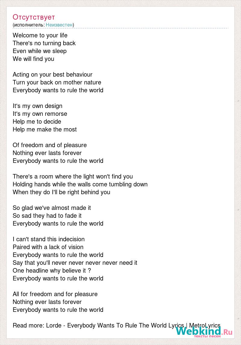 Welcome to your life There's no turning back Even while we sleep We will find you Acting on your best behaviour Turn your back on mother nature Everybody wants to rule the world It's my own design It's my own remorse Help me to decide Help me make the most Of freedom and of pleasure Nothing ever lasts forever Everybody wants to rule the world There's a room where the light won't find you Holding hands while the walls come tumbling down When they do I'll be right behind you So glad we've almost made it So sad they had to fade it Everybody wants to rule the world I can't stand this indecision Paired with a lack of vision Everybody wants to rule the world Say that you'll never never never never need it One headline why believe it ? Everybody wants to rule the world All for freedom and for pleasure Nothing ever lasts forever Everybody wants to rule the world Read more: Lorde - Everybody Wants To Rule The World Lyrics | MetroLyrics