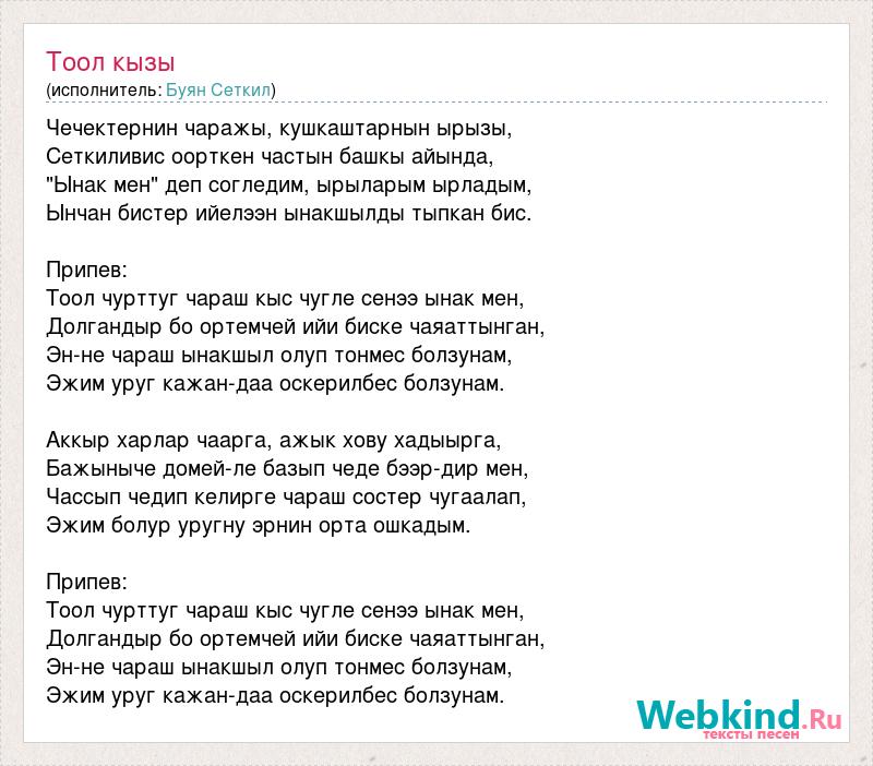 Чечектернин чаражы, кушкаштарнын ырызы, Сеткиливис оорткен частын башкы айында, "Ынак мен" деп согледим, ырыларым ырладым, Ынчан бистер ийелээн ынакшылды тыпкан бис. Припев: Тоол чурттуг чараш кыс чугле сенээ ынак мен, Долгандыр бо ортемчей ийи биске чаяаттынган, Эн-не чараш ынакшыл олуп тонмес болзунам, Эжим уруг кажан-даа оскерилбес болзунам. Аккыр харлар чаарга, ажык хову хадыырга, Бажыныче домей-ле базып чеде бээр-дир мен, Чассып чедип келирге чараш состер чугаалап, Эжим болур уругну эрнин орта ошкадым. Припев: Тоол чурттуг чараш кыс чугле сенээ ынак мен, Долгандыр бо ортемчей ийи биске чаяаттынган, Эн-не чараш ынакшыл олуп тонмес болзунам, Эжим уруг кажан-даа оскерилбес болзунам.