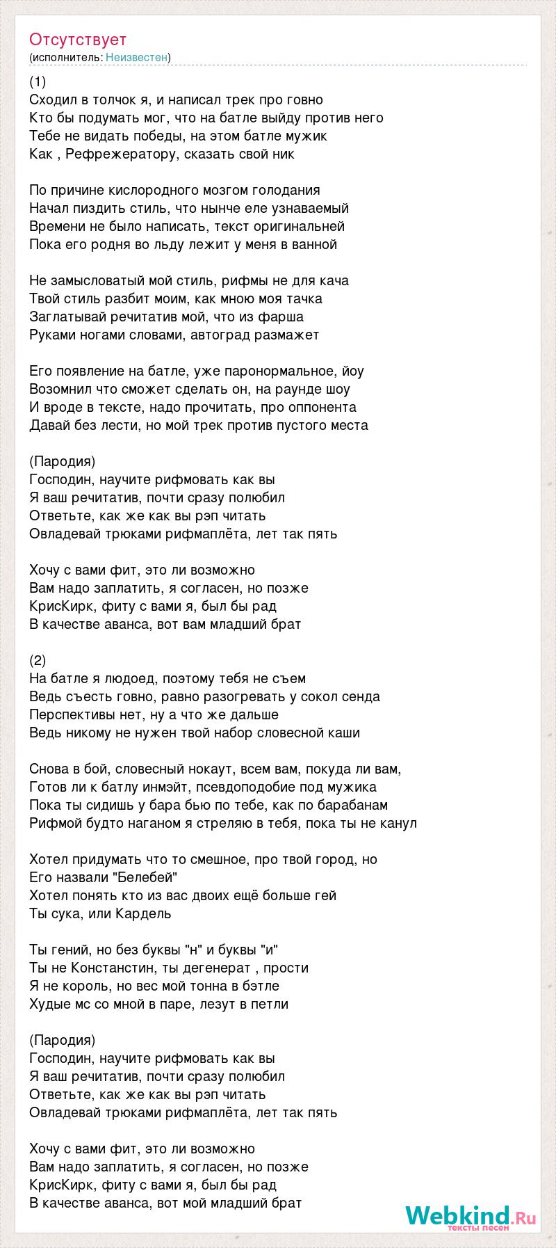 (1) Сходил в толчок я, и написал трек про говно Кто бы подумать мог, что на батле выйду против него Тебе не видать победы, на этом батле мужик Как , Рефрежератору, сказать свой ник По причине кислородного мозгом голодания Начал пиздить стиль, что нынче еле узнаваемый Времени не было написать, текст оригинальней Пока его родня во льду лежит у меня в ванной Не замысловатый мой стиль, рифмы не для кача Твой стиль разбит моим, как мною моя тачка Заглатывай речитатив мой, что из фарша Руками ногами словами, автоград размажет Его появление на батле, уже паронормальное, йоу Возомнил что сможет сделать он, на раунде шоу И вроде в тексте, надо прочитать, про оппонента Давай без лести, но мой трек против пустого места (Пародия) Господин, научите рифмовать как вы Я ваш речитатив, почти сразу полюбил Ответьте, как же как вы рэп читать Овладевай трюками рифмаплёта, лет так пять Хочу с вами фит, это ли возможно Вам надо заплатить, я согласен, но позже КрисКирк, фиту с вами я, был бы рад В качестве аванса, вот вам младший брат (2) На батле я людоед, поэтому тебя не съем Ведь съесть говно, равно разогревать у сокол сенда Перспективы нет, ну а что же дальше Ведь никому не нужен твой набор словесной каши Снова в бой, словесный нокаут, всем вам, покуда ли вам, Готов ли к батлу инмэйт, псевдоподобие под мужика Пока ты сидишь у бара бью по тебе, как по барабанам Рифмой будто наганом я стреляю в тебя, пока ты не канул Хотел придумать что то смешное, про твой город, но Его назвали "Белебей" Хотел понять кто из вас двоих ещё больше гей Ты сука, или Кардель Ты гений, но без буквы "н" и буквы "и" Ты не Констанстин, ты дегенерат , прости Я не король, но вес мой тонна в бэтле Худые мс со мной в паре, лезут в петли (Пародия) Господин, научите рифмовать как вы Я ваш речитатив, почти сразу полюбил Ответьте, как же как вы рэп читать Овладевай трюками рифмаплёта, лет так пять Хочу с вами фит, это ли возможно Вам надо заплатить, я согласен, но позже КрисКирк, фиту с вами я, был бы рад В качестве аванса, вот мой младший брат