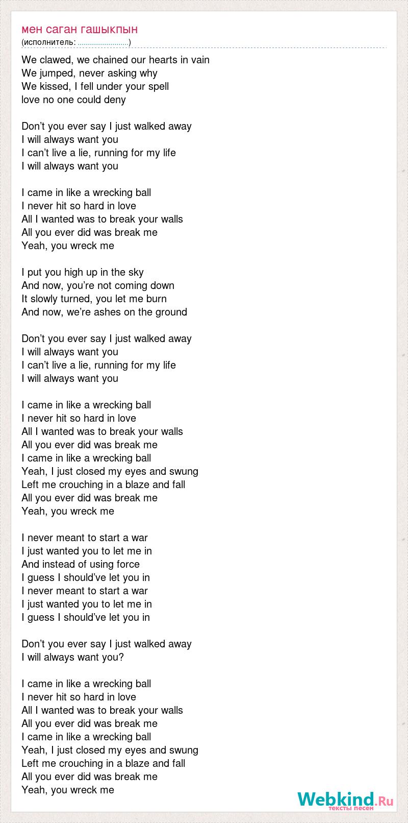 We clawed, we chained our hearts in vain We jumped, never asking why We kissed, I fell under your spell love no one could deny Don’t you ever say I just walked away I will always want you I can’t live a lie, running for my life I will always want you I came in like a wrecking ball I never hit so hard in love All I wanted was to break your walls All you ever did was break me Yeah, you wreck me I put you high up in the sky And now, you’re not coming down It slowly turned, you let me burn And now, we’re ashes on the ground Don’t you ever say I just walked away I will always want you I can’t live a lie, running for my life I will always want you I came in like a wrecking ball I never hit so hard in love All I wanted was to break your walls All you ever did was break me I came in like a wrecking ball Yeah, I just closed my eyes and swung Left me crouching in a blaze and fall All you ever did was break me Yeah, you wreck me I never meant to start a war I just wanted you to let me in And instead of using force I guess I should’ve let you in I never meant to start a war I just wanted you to let me in I guess I should’ve let you in Don’t you ever say I just walked away I will always want you? I came in like a wrecking ball I never hit so hard in love All I wanted was to break your walls All you ever did was break me I came in like a wrecking ball Yeah, I just closed my eyes and swung Left me crouching in a blaze and fall All you ever did was break me Yeah, you wreck me