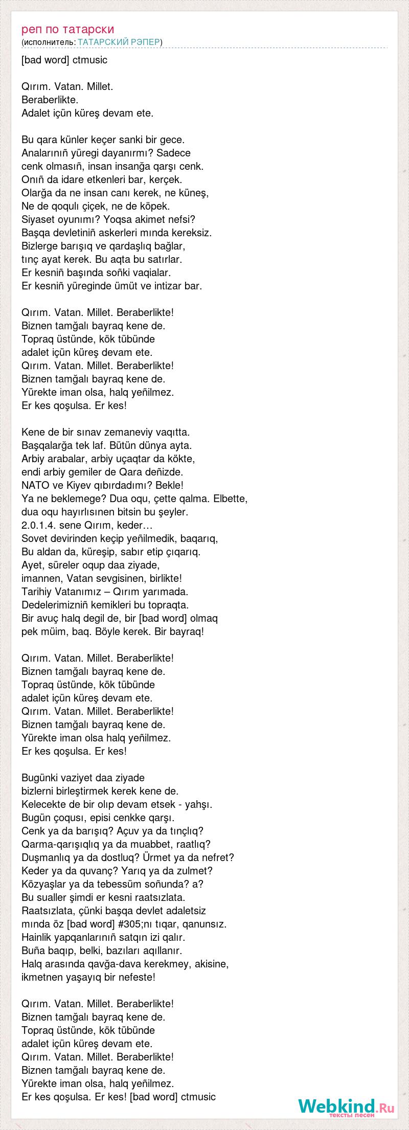 [bad word] ctmusic Qırım. Vatan. Millet. Beraberlikte. Adalet içün küreş devam ete. Bu qara künler keçer sanki bir gece. Analarınıñ yüregi dayanırmı? Sadece cenk olmasıñ, insan insanğa qarşı cenk. Onıñ da idare etkenleri bar, kerçek. Olarğa da ne insan canı kerek, ne küneş, Ne de qoqulı çiçek, ne de köpek. Siyaset oyunımı? Yoqsa akimet nefsi? Başqa devletiniñ askerleri mında kereksiz. Bizlerge barışıq ve qardaşlıq bağlar, tınç ayat kerek. Bu aqta bu satırlar. Er kesniñ başında soñki vaqialar. Er kesniñ yüreginde ümüt ve intizar bar. Qırım. Vatan. Millet. Beraberlikte! Biznen tamğalı bayraq kene de. Topraq üstünde, kök tübünde adalet içün küreş devam ete. Qırım. Vatan. Millet. Beraberlikte! Biznen tamğalı bayraq kene de. Yürekte iman olsa, halq yeñilmez. Er kes qoşulsa. Er kes! Kene de bir sınav zemaneviy vaqıtta. Başqalarğa tek laf. Bütün dünya ayta. Arbiy arabalar, arbiy uçaqtar da kökte, endi arbiy gemiler de Qara deñizde. NATO ve Kiyev qıbırdadımı? Bekle! Ya ne beklemege? Dua oqu, çette qalma. Elbette, dua oqu hayırlısınen bitsin bu şeyler. 2.0.1.4. sene Qırım, keder… Sovet devirinden keçip yeñilmedik, baqarıq, Bu aldan da, küreşip, sabır etip çıqarıq. Ayet, süreler oqup daa ziyade, imannen, Vatan sevgisinen, birlikte! Tarihiy Vatanımız – Qırım yarımada. Dedelerimizniñ kemikleri bu topraqta. Bir avuç halq degil de, bir [bad word] olmaq pek müim, baq. Böyle kerek. Bir bayraq! Qırım. Vatan. Millet. Beraberlikte! Biznen tamğalı bayraq kene de. Topraq üstünde, kök tübünde adalet içün küreş devam ete. Qırım. Vatan. Millet. Beraberlikte! Biznen tamğalı bayraq kene de. Yürekte iman olsa halq yeñilmez. Er kes qoşulsa. Er kes! Bugünki vaziyet daa ziyade bizlerni birleştirmek kerek kene de. Kelecekte de bir olıp devam etsek - yahşı. Bugün çoqusı, episi cenkke qarşı. Cenk ya da barışıq? Açuv ya da tınçlıq? Qarma-qarışıqlıq ya da muabbet, raatlıq? Duşmanlıq ya da dostluq? Ürmet ya da nefret? Keder ya da quvanç? Yarıq ya da zulmet? Közyaşlar ya da tebessüm soñunda? a? Bu sualler şimdi er kesni raatsızlata. Raatsızlata, çünki başqa devlet adaletsiz mında öz [bad word] #305;nı tıqar, qanunsız. Hainlik yapqanlarınıñ satqın izi qalır. Buña baqıp, belki, bazıları aqıllanır. Halq arasında qavğa-dava kerekmey, akisine, ikmetnen yaşayıq bir nefeste! Qırım. Vatan. Millet. Beraberlikte! Biznen tamğalı bayraq kene de. Topraq üstünde, kök tübünde adalet içün küreş devam ete. Qırım. Vatan. Millet. Beraberlikte! Biznen tamğalı bayraq kene de. Yürekte iman olsa, halq yeñilmez. Er kes qoşulsa. Er kes! [bad word] ctmusic