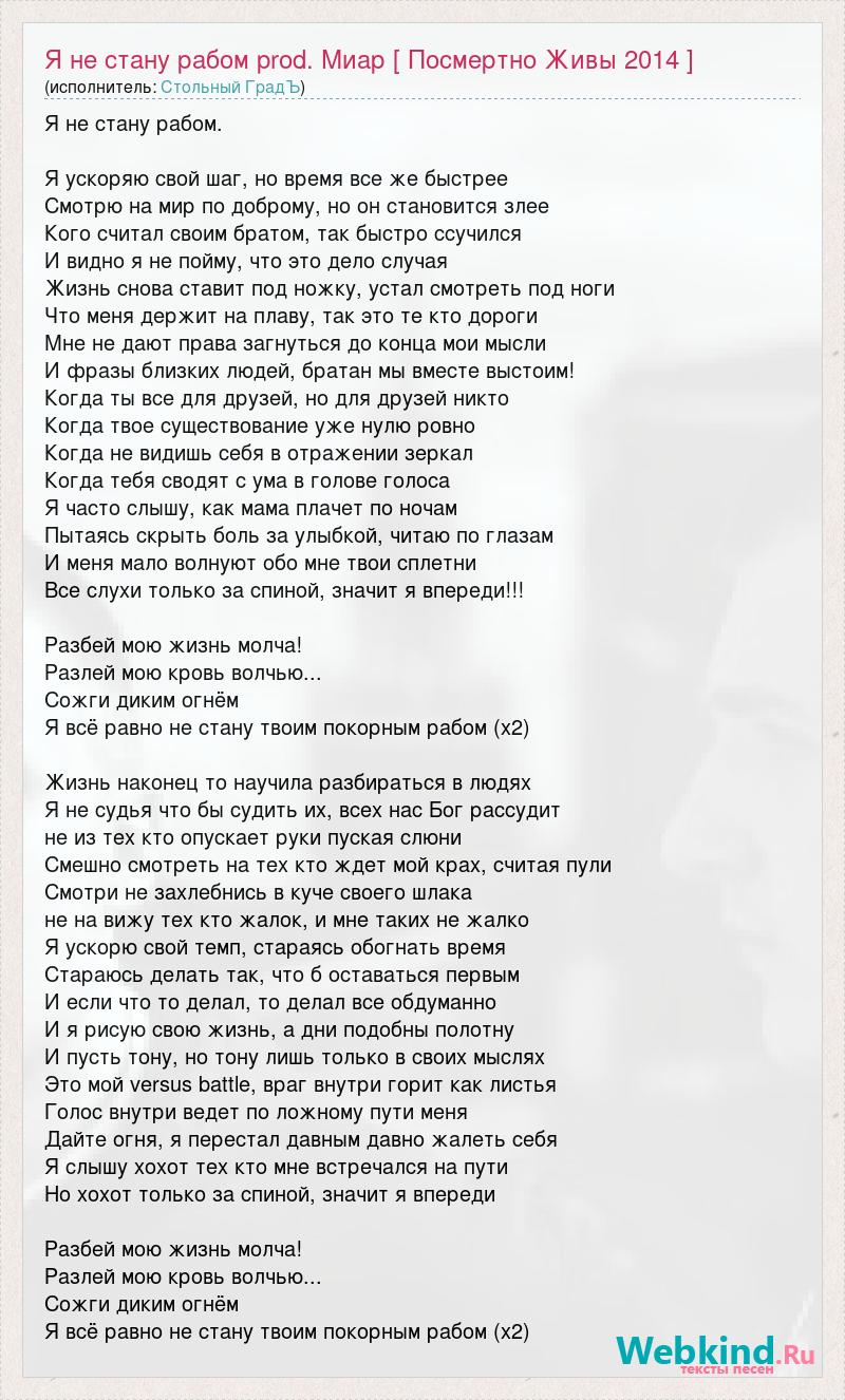 Я не стану рабом. Я ускоряю свой шаг, но время все же быстрее Смотрю на мир по доброму, но он становится злее Кого считал своим братом, так быстро ссучился И видно я не пойму, что это дело случая Жизнь снова ставит под ножку, устал смотреть под ноги Что меня держит на плаву, так это те кто дороги Мне не дают права загнуться до конца мои мысли И фразы близких людей, братан мы вместе выстоим! Когда ты все для друзей, но для друзей никто Когда твое существование уже нулю ровно Когда не видишь себя в отражении зеркал Когда тебя сводят с ума в голове голоса Я часто слышу, как мама плачет по ночам Пытаясь скрыть боль за улыбкой, читаю по глазам И меня мало волнуют обо мне твои сплетни Все слухи только за спиной, значит я впереди!!! Разбей мою жизнь молча! Разлей мою кровь волчью... Сожги диким огнём Я всё равно не стану твоим покорным рабом (х2) Жизнь наконец то научила разбираться в людях Я не судья что бы судить их, всех нас Бог рассудит не из тех кто опускает руки пуская слюни Смешно смотреть на тех кто ждет мой крах, считая пули Смотри не захлебнись в куче своего шлака не на вижу тех кто жалок, и мне таких не жалко Я ускорю свой темп, стараясь обогнать время Стараюсь делать так, что б оставаться первым И если что то делал, то делал все обдуманно И я рисую свою жизнь, а дни подобны полотну И пусть тону, но тону лишь только в своих мыслях Это мой versus battle, враг внутри горит как листья Голос внутри ведет по ложному пути меня Дайте огня, я перестал давным давно жалеть себя Я слышу хохот тех кто мне встречался на пути Но хохот только за спиной, значит я впереди Разбей мою жизнь молча! Разлей мою кровь волчью... Сожги диким огнём Я всё равно не стану твоим покорным рабом (х2)