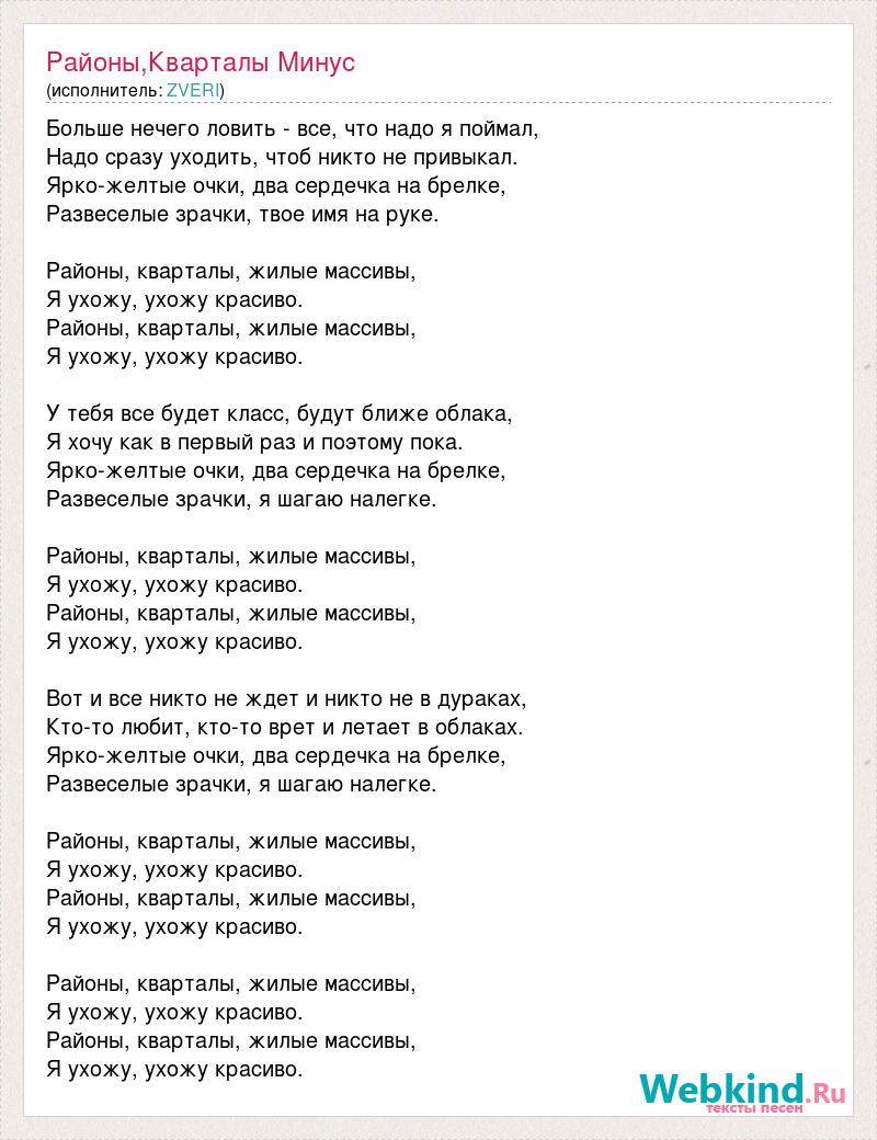 Больше нечего ловить - все, что надо я поймал, Надо сразу уходить, чтоб никто не привыкал. Ярко-желтые очки, два сердечка на брелке, Развеселые зрачки, твое имя на руке. Районы, кварталы, жилые массивы, Я ухожу, ухожу красиво. Районы, кварталы, жилые массивы, Я ухожу, ухожу красиво. У тебя все будет класс, будут ближе облака, Я хочу как в первый раз и поэтому пока. Ярко-желтые очки, два сердечка на брелке, Развеселые зрачки, я шагаю налегке. Районы, кварталы, жилые массивы, Я ухожу, ухожу красиво. Районы, кварталы, жилые массивы, Я ухожу, ухожу красиво. Вот и все никто не ждет и никто не в дураках, Кто-то любит, кто-то врет и летает в облаках. Ярко-желтые очки, два сердечка на брелке, Развеселые зрачки, я шагаю налегке. Районы, кварталы, жилые массивы, Я ухожу, ухожу красиво. Районы, кварталы, жилые массивы, Я ухожу, ухожу красиво. Районы, кварталы, жилые массивы, Я ухожу, ухожу красиво. Районы, кварталы, жилые массивы, Я ухожу, ухожу красиво.
