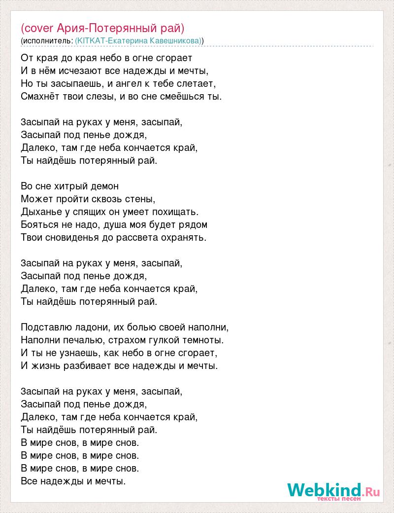 От края до края небо в огне сгорает И в нём исчезают все надежды и мечты, Но ты засыпаешь, и ангел к тебе слетает, Смахнёт твои слезы, и во сне смеёшься ты. 3асыпай на руках у меня, засыпай, Засыпай под пенье дождя, Далеко, там где неба кончается край, Ты найдёшь потерянный рай. Во сне хитрый демон Может пройти сквозь стены, Дыханье у спящих он умеет похищать. Бояться не надо, душа моя будет рядом Твои сновиденья до рассвета охранять. 3асыпай на руках у меня, засыпай, Засыпай под пенье дождя, Далеко, там где неба кончается край, Ты найдёшь потерянный рай. Подставлю ладони, их болью своей наполни, Наполни печалью, страхом гулкой темноты. И ты не узнаешь, как небо в огне сгорает, И жизнь разбивает все надежды и мечты. 3асыпай на руках у меня, засыпай, Засыпай под пенье дождя, Далеко, там где неба кончается край, Ты найдёшь потерянный рай. В мире снов, в мире снов. В мире снов, в мире снов. В мире снов, в мире снов. Все надежды и мечты.