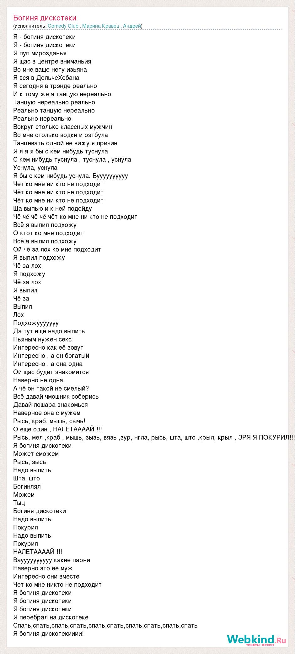 Я - богиня дискотеки Я - богиня дискотеки Я пуп мирозданья Я щас в центре вниманьия Во мне ваще нету изьяна Я вся в ДольчеХобана Я сегодня в трэнде реально И к тому же я танцую нереально Танцую нереально реально Реально танцую нереально Реально нереально Вокруг столько классных мужчин Во мне столько водки и рэтбула Танцевать одной не вижу я причин Я я я я бы с кем нибудь туснула С кем нибудь туснула , туснула , уснула Уснула, уснула Я бы с кем нибудь уснула. Вуууууууууу Чет ко мне ни кто не подходит Чёт ко мне ни кто не подходит Чёт ко мне ни кто не подходит Ща выпью и к ней подойду Чё чё чё чё чёт ко мне ни кто не подходит Всё я выпил подхожу О ктот ко мне подходит Всё я выпил подхожу Ой чё за лох ко мне подходит Я выпил подхожу Чё за лох Я подхожу Чё за лох Я выпил Чё за Выпил Лох Подхожууууууу Да тут ещё надо выпить Пьяным нужен секс Интересно как её зовут Интересно , а он богатый Интересно , а она одна Ой щас будет знакомится Наверно не одна А чё он такой не смелый? Всё давай чмошник соберись Давай лошара знакомься Наверное она с мужем Рысь, краб, мышь, сычь! О ещё один , НАЛЕТААААЙ !!! Рысь, мел ,краб , мышь, зызь, вязь ,зур, нгла, рысь, шта, што ,крыл, крыл , ЗРЯ Я ПОКУРИЛ!!! Я богиня дискотеки Может сможем Рысь, зысь Надо выпить Шта, што Богиняяя Можем Тыц Богиня дискотеки Надо выпить Покурил Надо выпить Покурил НАЛЕТААААЙ !!! Вауууууууууу какие парни Наверно это ее муж Интересно они вместе Чет ко мне никто не подходит Я богиня дискотеки Я богиня дискотеки Я богиня дискотеки Я перебрал на дискотеке Спать,спать,спать,спать,спать,спать,спать,спать,спать,спать Я богиня дискотекииии!