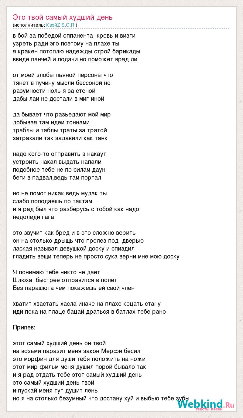 в бой за победой оппанента кровь и визги узреть ради эго поэтому на плахе ты я кракен потоплю надежды строй барикады ввиде панчей и подачи но поможет вряд ли от моей злобы пьяной персоны что тянет в пучину мысли бессоной но разумности ноль я за стеной дабы лаи не достали в миг иной да бывает что разьедают мой мир добывая там идеи тоннами траблы и таблы траты за тратой затрахали так задавили как танк надо кого-то отправить в накаут устроить накал выдать напалм подобное тебе не по силам даун беги в падвал,ведь там портал но не помог никак ведь мудак ты слабо поподаешь по тактам и я рад был что разберусь с тобой как надо недоледи гага это звучит как бред и в это сложно верить он на столько дрыщь что пролез под дверью лаская называл девушкой доску и спиздил гладить вещи теперь не просто сука верни мне мою доску Я понимаю тебе никто не дает Шлюха быстрее отправится в полет Без парашюта чем покажешь ей свой член хватит хвастать хасла иначе на плахе коцать стану иди пока на плаце бацай драться в батлах тебе рано Припев: этот самый худший день он твой на возьми паразит меня закон Мерфи бесил это морфин для души тебя положить на ножи этот мир фильм меня душил порой бывало так и я рад отдать тебе этот самый худший день это самый худший день твой и пускай меня тут душит лень но я на столько безумный что достану хуй и выбью тебе зубы