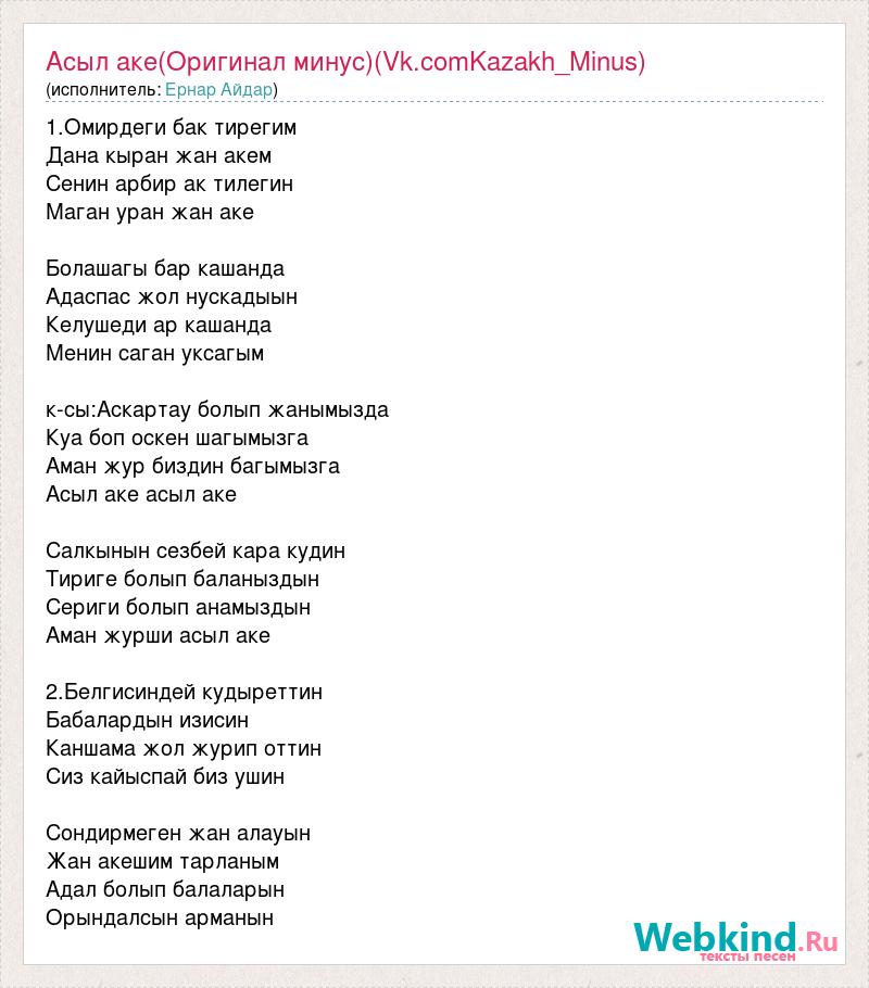 1.Омирдеги бак тирегим Дана кыран жан акем Сенин арбир ак тилегин Маган уран жан аке Болашагы бар кашанда Адаспас жол нускадыын Келушеди ар кашанда Менин саган уксагым к-сы:Аскартау болып жанымызда Куа боп оскен шагымызга Аман жур биздин багымызга Асыл аке асыл аке Салкынын сезбей кара кудин Тириге болып баланыздын Сериги болып анамыздын Аман журши асыл аке 2.Белгисиндей кудыреттин Бабалардын изисин Каншама жол журип оттин Сиз кайыспай биз ушин Сондирмеген жан алауын Жан акешим тарланым Адал болып балаларын Орындалсын арманын