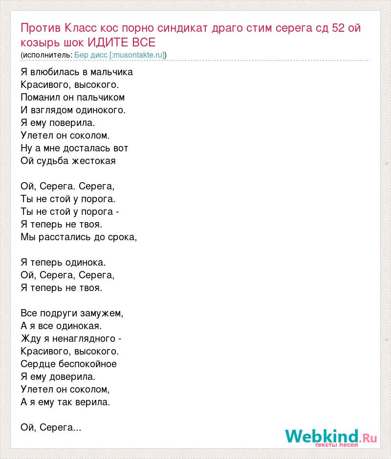 Я влюбилась в мальчика Красивого, высокого. Поманил он пальчиком И взглядом одинокого. Я ему поверила. Улетел он соколом. Ну а мне досталась вот Ой судьба жестокая Ой, Серега. Серега, Ты не стой у порога. Ты не стой у порога - Я теперь не твоя. Мы расстались до срока, Я теперь одинока. Ой, Серега, Серега, Я теперь не твоя. Все подруги замужем, А я все одинокая. Жду я ненаглядного - Красивого, высокого. Сердце беспокойное Я ему доверила. Улетел он соколом, А я ему так верила. Ой, Серега...