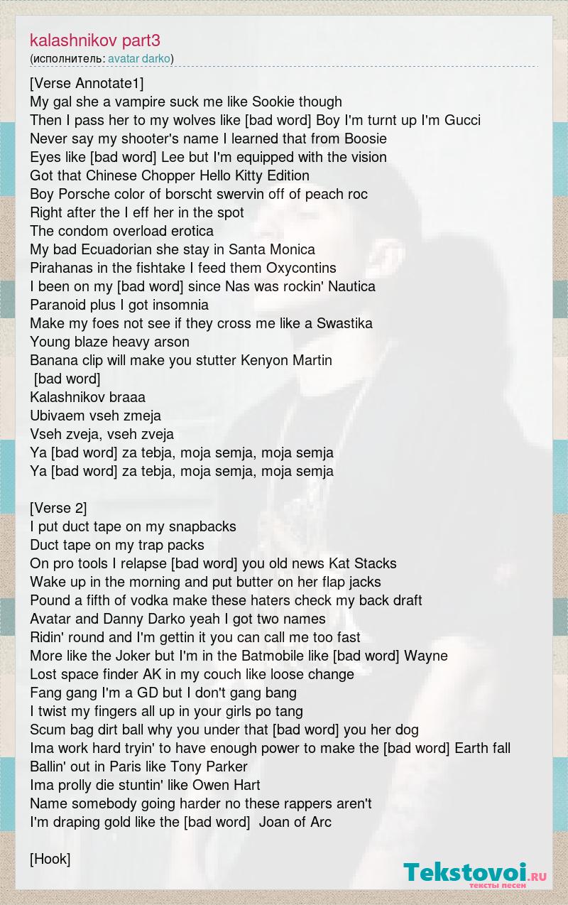 [Verse Annotate1] My gal she a vampire suck me like Sookie though Then I pass her to my wolves like Ricky Rubio Boy I'm turnt up I'm Gucci Never say my shooter's name I learned that from Boosie Eyes like Bruce Lee but I'm equipped with the vision Got that Chinese Chopper Hello Kitty Edition Boy Porsche color of borscht swervin off of peach roc Right after the I eff her in the spot The condom overload erotica My bad Ecuadorian she stay in Santa Monica Pirahanas in the fishtake I feed them Oxycontins I been on my [bad word] since Nas was rockin' Nautica Paranoid plus I got insomnia Make my foes not see if they cross me like a Swastika Young blaze heavy arson Banana clip will make you stutter Kenyon Martin [Hook](Russian) Kalashnikov braaa Ubivaem vseh zmeja Vseh zveja, vseh zveja Ya umru za tebja, moja semja, moja semja Ya umru za tebja, moja semja, moja semja [Verse 2] I put duct tape on my snapbacks Duct tape on my trap packs On pro tools I relapse [bad word] you old news Kat Stacks Wake up in the morning and put butter on her flap jacks Pound a fifth of vodka make these haters check my back draft Avatar and Danny Darko yeah I got two names Ridin' round and I'm gettin it you can call me too fast More like the Joker but I'm in the Batmobile like Bruce Wayne Lost space finder AK in my couch like loose change Fang gang I'm a GD but I don't gang bang I twist my fingers all up in your girls po tang Scum bag dirt ball why you under that [bad word] you her dog Ima work hard tryin' to have enough power to make the [bad word] Earth fall Ballin' out in Paris like Tony Parker Ima prolly die stuntin' like Owen Hart Name somebody going harder no these rappers aren't I'm draping gold like the [bad word] Joan of Arc [Hook]