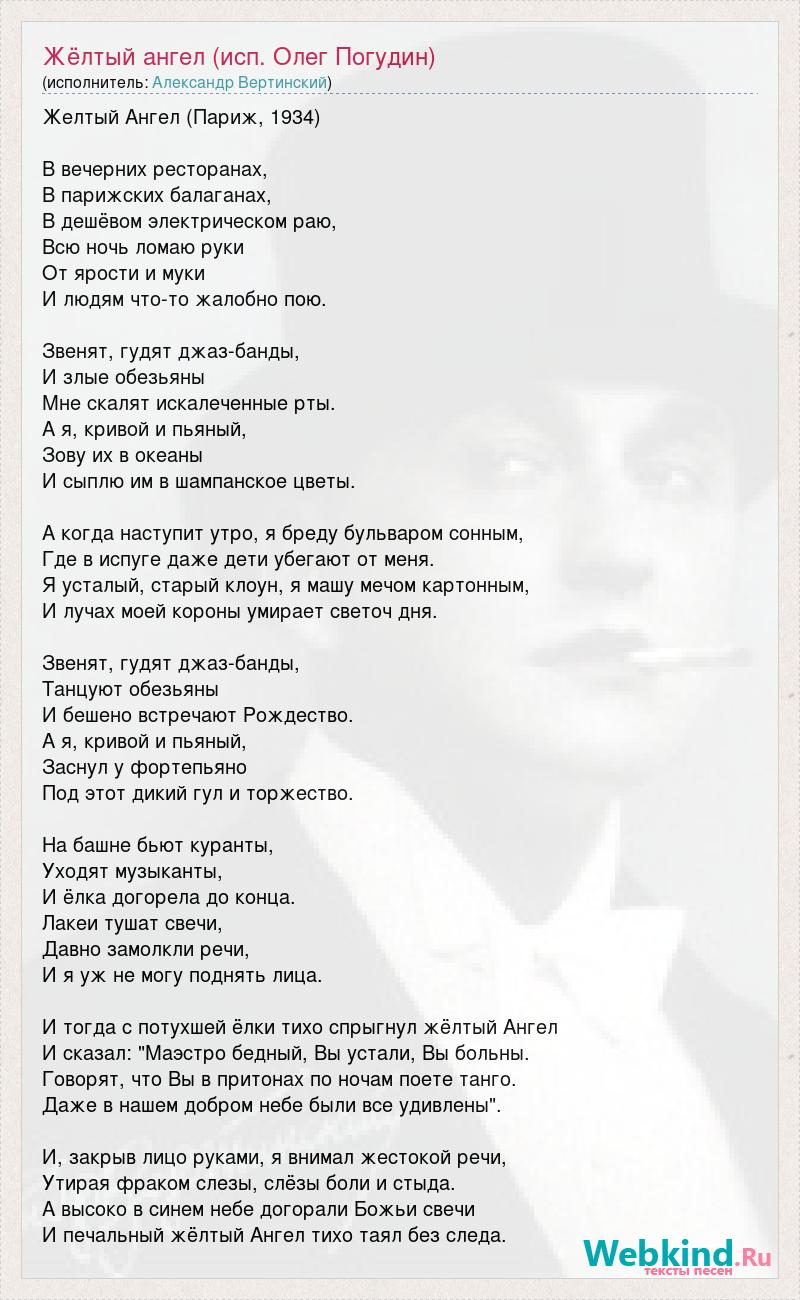 Желтый Ангел (Париж, 1934) В вечерних ресторанах, В парижских балаганах, В дешёвом электрическом раю, Всю ночь ломаю руки От ярости и муки И людям что-то жалобно пою. Звенят, гудят джаз-банды, И злые обезьяны Мне скалят искалеченные рты. А я, кривой и пьяный, Зову их в океаны И сыплю им в шампанское цветы. А когда наступит утро, я бреду бульваром сонным, Где в испуге даже дети убегают от меня. Я усталый, старый клоун, я машу мечом картонным, И лучах моей короны умирает светоч дня. Звенят, гудят джаз-банды, Танцуют обезьяны И бешено встречают Рождество. А я, кривой и пьяный, Заснул у фортепьяно Под этот дикий гул и торжество. На башне бьют куранты, Уходят музыканты, И ёлка догорела до конца. Лакеи тушат свечи, Давно замолкли речи, И я уж не могу поднять лица. И тогда с потухшей ёлки тихо спрыгнул жёлтый Ангел И сказал: "Маэстро бедный, Вы устали, Вы больны. Говорят, что Вы в притонах по ночам поете танго. Даже в нашем добром небе были все удивлены". И, закрыв лицо руками, я внимал жестокой речи, Утирая фраком слезы, слёзы боли и стыда. А высоко в синем небе догорали Божьи свечи И печальный жёлтый Ангел тихо таял без следа.