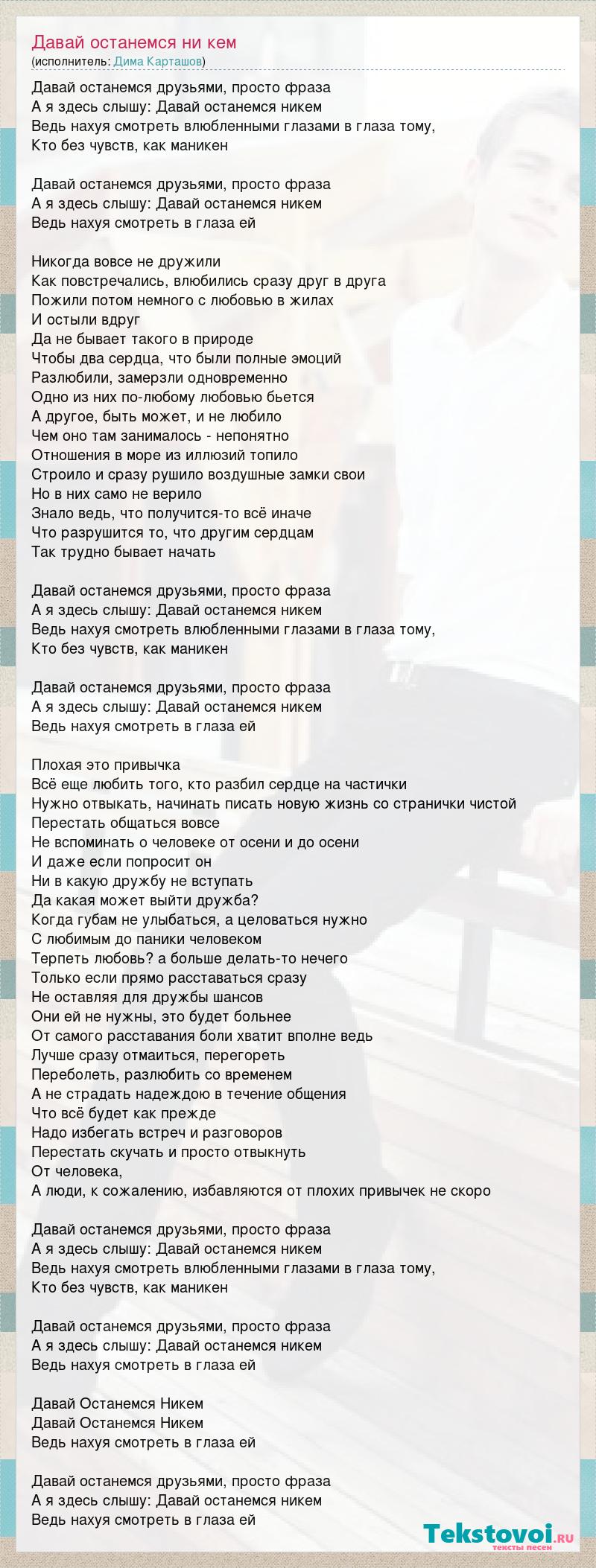 Давай останемся друзьями, просто фраза А я здесь слышу: Давай останемся никем Ведь нахуя смотреть влюбленными глазами в глаза тому, Кто без чувств, как маникен Давай останемся друзьями, просто фраза А я здесь слышу: Давай останемся никем Ведь нахуя смотреть в глаза ей Никогда вовсе не дружили Как повстречались, влюбились сразу друг в друга Пожили потом немного с любовью в жилах И остыли вдруг Да не бывает такого в природе Чтобы два сердца, что были полные эмоций Разлюбили, замерзли одновременно Одно из них по-любому любовью бьется А другое, быть может, и не любило Чем оно там занималось - непонятно Отношения в море из иллюзий топило Строило и сразу рушило воздушные замки свои Но в них само не верило Знало ведь, что получится-то всё иначе Что разрушится то, что другим сердцам Так трудно бывает начать Давай останемся друзьями, просто фраза А я здесь слышу: Давай останемся никем Ведь нахуя смотреть влюбленными глазами в глаза тому, Кто без чувств, как маникен Давай останемся друзьями, просто фраза А я здесь слышу: Давай останемся никем Ведь нахуя смотреть в глаза ей Плохая это привычка Всё еще любить того, кто разбил сердце на частички Нужно отвыкать, начинать писать новую жизнь со странички чистой Перестать общаться вовсе Не вспоминать о человеке от осени и до осени И даже если попросит он Ни в какую дружбу не вступать Да какая может выйти дружба? Когда губам не улыбаться, а целоваться нужно С любимым до паники человеком Терпеть любовь? а больше делать-то нечего Только если прямо расставаться сразу Не оставляя для дружбы шансов Они ей не нужны, это будет больнее От самого расставания боли хватит вполне ведь Лучше сразу отмаиться, перегореть Переболеть, разлюбить со временем А не страдать надеждою в течение общения Что всё будет как прежде Надо избегать встреч и разговоров Перестать скучать и просто отвыкнуть От человека, А люди, к сожалению, избавляются от плохих привычек не скоро Давай останемся друзьями, просто фраза А я здесь слышу: Давай останемся никем Ведь нахуя смотреть влюбленными глазами в глаза тому, Кто без чувств, как маникен Давай останемся друзьями, просто фраза А я здесь слышу: Давай останемся никем Ведь нахуя смотреть в глаза ей Давай Останемся Никем Давай Останемся Никем Ведь нахуя смотреть в глаза ей Давай останемся друзьями, просто фраза А я здесь слышу: Давай останемся никем Ведь нахуя смотреть в глаза ей