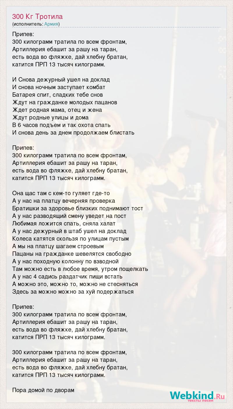 Припев: 300 килограмм тратила по всем фронтам, Артиллерия ебашит за рашу на таран, есть вода во фляжке, дай хлебну братан, катится ПРП 13 тысяч килограмм. И Снова дежурный ушел на доклад И снова ночным заступает комбат Батарея спит, сладких тебе снов Ждут на гражданке молодых пацанов Ждет родная мама, отец и жена Ждут родные улицы и дома В 6 часов подъем и так охота спать И снова день за днем продолжаем блистать Припев: 300 килограмм тратила по всем фронтам, Артиллерия ебашит за рашу на таран, есть вода во фляжке, дай хлебну братан, катится ПРП 13 тысяч килограмм. Она щас там с кем-то гуляет где-то А у нас на платцу вечерняя проверка Братишки за здоровье близких поднимают тост А у нас разводящий смену уведет на пост Любимая ложится спать, сняла халат А у нас дежурный в штаб ушел на доклад Колеса катятся скользя по улицам пустым А мы на платцу шагаем строевым Пацаны на гражданке шевелятся свободно А у нас походную колонну по взводной Там можно есть в любое время, утром пощелкать А у нас 4 садись раздатчик пищи встать А можно это, можно то, можно не стесняться Здесь за можно можно за хуй подержаться Припев: 300 килограмм тратила по всем фронтам, Артиллерия ебашит за рашу на таран, есть вода во фляжке, дай хлебну братан, катится ПРП 13 тысяч килограмм. 300 килограмм тратила по всем фронтам, Артиллерия ебашит за рашу на таран, есть вода во фляжке, дай хлебну братан, катится ПРП 13 тысяч килограмм. Пора домой по дворам