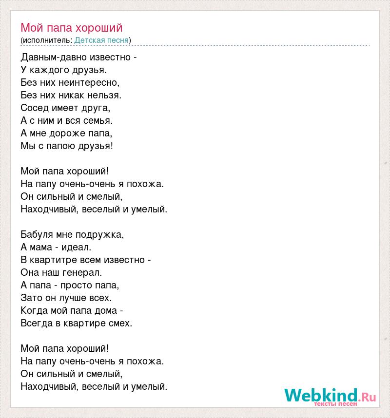 Давным-давно известно - У каждого друзья. Без них неинтересно, Без них никак нельзя. Сосед имеет друга, А с ним и вся семья. А мне дороже папа, Мы с папою друзья! Мой папа хороший! На папу очень-очень я похожа. Он сильный и смелый, Находчивый, веселый и умелый. Бабуля мне подружка, А мама - идеал. В квартитре всем известно - Она наш генерал. А папа - просто папа, Зато он лучше всех. Когда мой папа дома - Всегда в квартире смех. Мой папа хороший! На папу очень-очень я похожа. Он сильный и смелый, Находчивый, веселый и умелый.