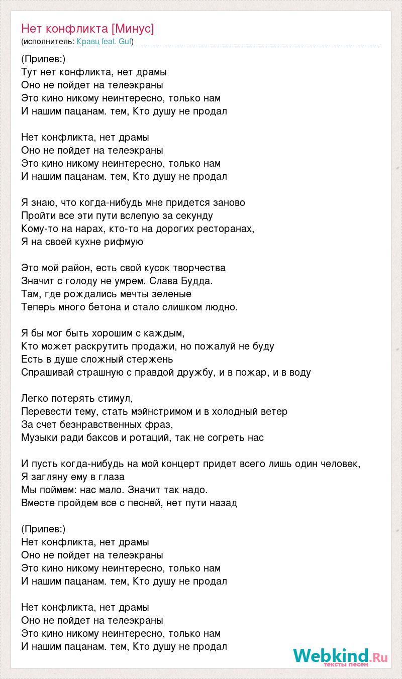 (Припев:) Тут нет конфликта, нет драмы Оно не пойдет на телеэкраны Это кино никому неинтересно, только нам И нашим пацанам. тем, Кто душу не продал Нет конфликта, нет драмы Оно не пойдет на телеэкраны Это кино никому неинтересно, только нам И нашим пацанам. тем, Кто душу не продал Я знаю, что когда-нибудь мне придется заново Пройти все эти пути вслепую за секунду Кому-то на нарах, кто-то на дорогих ресторанах, Я на своей кухне рифмую Это мой район, есть свой кусок творчества Значит с голоду не умрем. Слава Будда. Там, где рождались мечты зеленые Теперь много бетона и стало слишком людно. Я бы мог быть хорошим с каждым, Кто может раскрутить продажи, но пожалуй не буду Есть в душе сложный стержень Спрашивай страшную с правдой дружбу, и в пожар, и в воду Легко потерять стимул, Перевести тему, стать мэйнстримом и в холодный ветер За счет безнравственных фраз, Музыки ради баксов и ротаций, так не согреть нас И пусть когда-нибудь на мой концерт придет всего лишь один человек, Я загляну ему в глаза Мы поймем: нас мало. Значит так надо. Вместе пройдем все с песней, нет пути назад (Припев:) Нет конфликта, нет драмы Оно не пойдет на телеэкраны Это кино никому неинтересно, только нам И нашим пацанам. тем, Кто душу не продал Нет конфликта, нет драмы Оно не пойдет на телеэкраны Это кино никому неинтересно, только нам И нашим пацанам. тем, Кто душу не продал