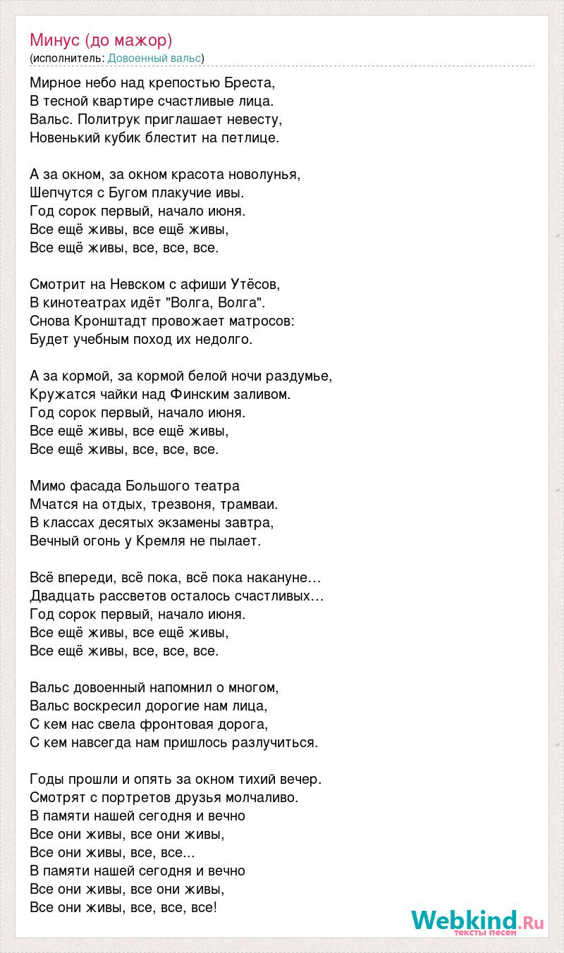 Мирное небо над крепостью Бреста, В тесной квартире счастливые лица. Вальс. Политрук приглашает невесту, Новенький кубик блестит на петлице. А за окном, за окном красота новолунья, Шепчутся с Бугом плакучие ивы. Год сорок первый, начало июня. Все ещё живы, все ещё живы, Все ещё живы, все, все, все. Смотрит на Невском с афиши Утёсов, В кинотеатрах идёт "Волга, Волга". Снова Кронштадт провожает матросов: Будет учебным поход их недолго. А за кормой, за кормой белой ночи раздумье, Кружатся чайки над Финским заливом. Год сорок первый, начало июня. Все ещё живы, все ещё живы, Все ещё живы, все, все, все. Мимо фасада Большого театра Мчатся на отдых, трезвоня, трамваи. В классах десятых экзамены завтра, Вечный огонь у Кремля не пылает. Всё впереди, всё пока, всё пока накануне… Двадцать рассветов осталось счастливых… Год сорок первый, начало июня. Все ещё живы, все ещё живы, Все ещё живы, все, все, все. Вальс довоенный напомнил о многом, Вальс воскресил дорогие нам лица, С кем нас свела фронтовая дорога, С кем навсегда нам пришлось разлучиться. Годы прошли и опять за окном тихий вечер. Смотрят с портретов друзья молчаливо. В памяти нашей сегодня и вечно Все они живы, все они живы, Все они живы, все, все... В памяти нашей сегодня и вечно Все они живы, все они живы, Все они живы, все, все, все!